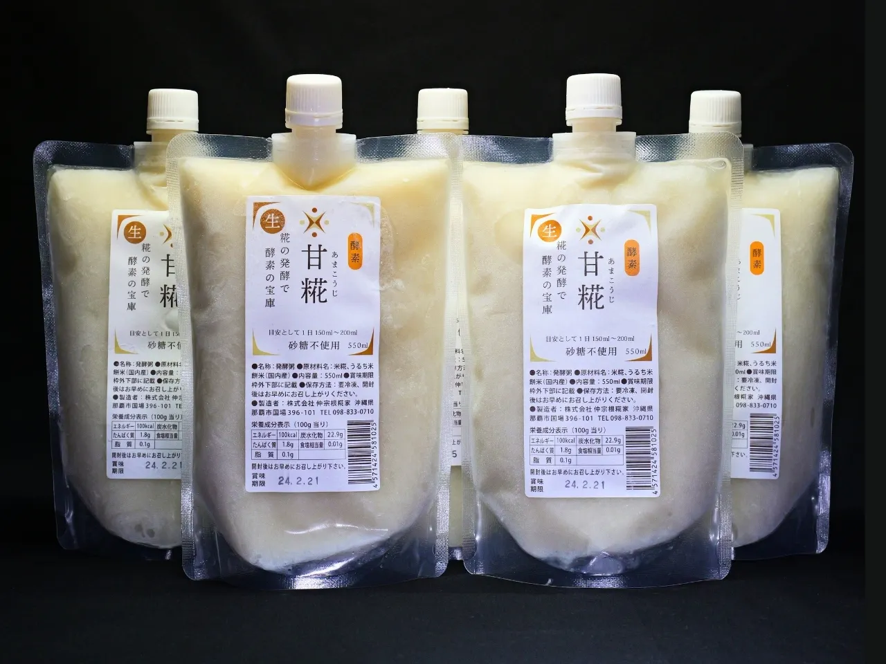 ・甘糀:仲宗根糀家の最も人気の商品です。甘糀とはすなわち甘酒ですが、ノンアルコールで酒精などの添加物を一切入れていない純粋なお米の甘みをお楽しみいただけます。仲宗根糀家の甘酒は、一般的な甘酒よりもじっくりと時間をかけて甘みを引き出しているため、飲みやすく自然な甘みが特徴でリピーターのお客様が非常に多いのが特徴です。是非、他の甘酒と飲み比べしてみてください。