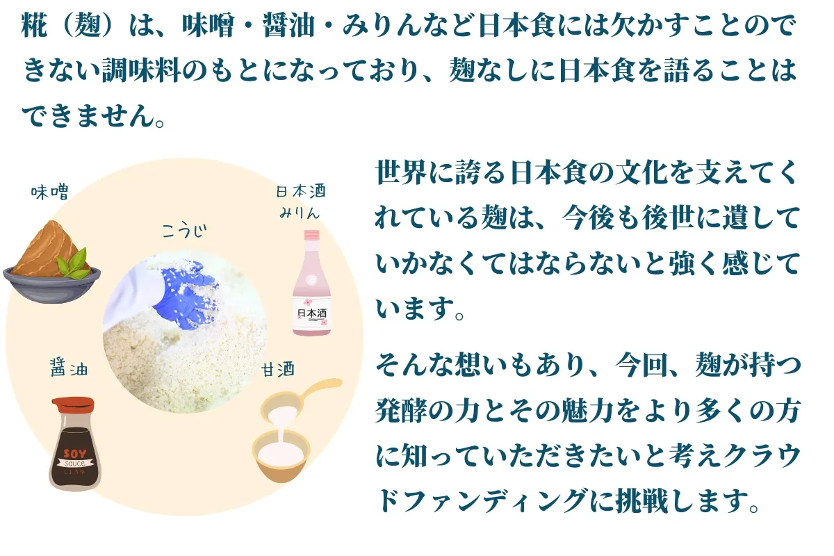 麹は昔から日本人が紡いできた、世界に誇ることができる日本食を支える調味料です。