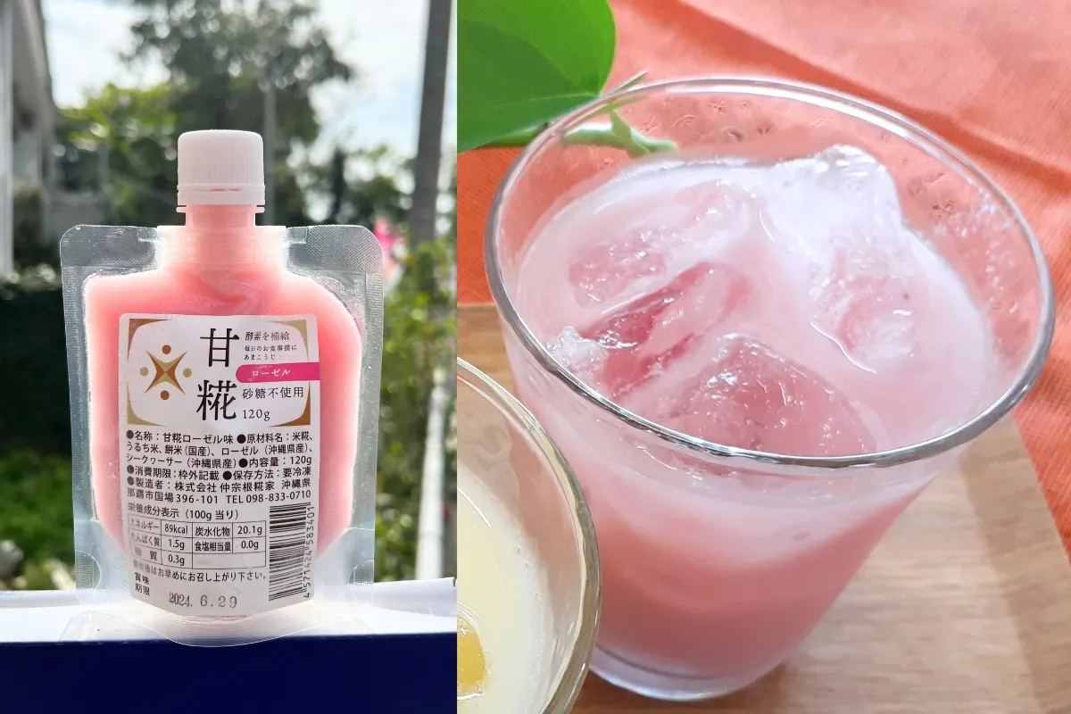 ・甘糀ローゼル:甘糀にビタミンやミネラルの豊富なローゼル(ハーブの一種)果汁と、沖縄産のシークワーサー果汁を混ぜ合わせてスッキリ飲みやすい味に仕上げました。甘酒が苦手なお子様でも飲みやすくなっています。暑い日やお風呂上がりの水分補給にもピッタリな商品です。