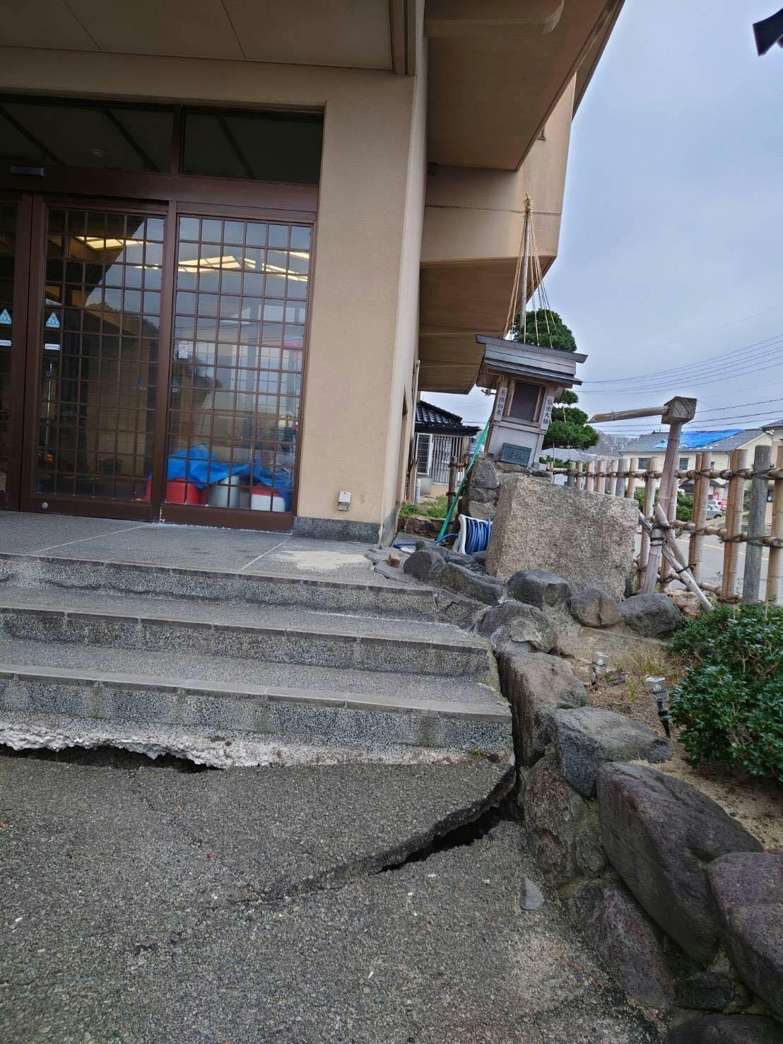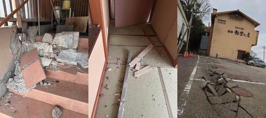 能登の庄の旅館は外見の損傷は少ないものの、地盤の傾きにより建物全体がわずかに傾いており、配管もほぼ切断されています。修繕方法については現在検討中です。
