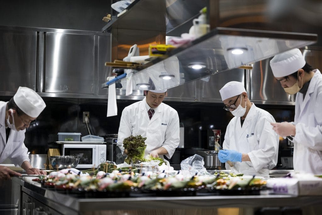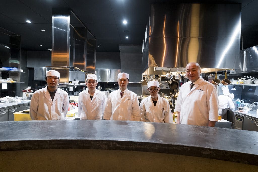 『能登の庄』キッチンチームと髙木慎一朗(日本料理 銭屋)さんです。 「写真:高橋俊充」