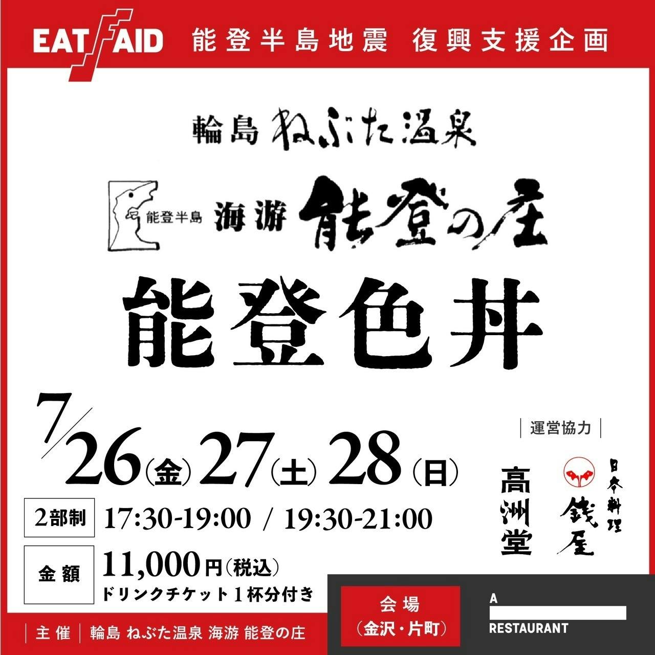 2024/07/18 21:46いつも能登の庄を応援いただきまして誠にありがとうございます。金沢のA_RESTAURANTさんの会場をお借りして、能登の庄を金沢で味わう企画の第二弾「能登色丼」を開催させていただきます!第1回目とは、また違ったかたちでおこないますので、ご家族でも気軽にお越しいただけます!(^^)!日程:7月26日(金曜日) :7月27日(土曜日) :7月28日(日曜日)場所:各日程 17:30~19:00 19:30~21:00 ※2部制となります料金:11,000円 税込(ワンドリンク付)お支払い:現金、クレジットカード有、電子決済有ご予約の際は、メインの能登の庄自慢の「丼」をお客様にお選びいただきます。①能登牛丼②ふぐ照り焼き丼③鰻かば焼き丼※ドリンクはカウンターに取りに来ていただくかたちになりますのでご了承ください。※追加のドリンクはチケットを現地でご購入いただけます。予約制(7月20日締切※A_RESTAURANTでは予約できません)予約受付担当:大向裕子■電話受付(10:00~17:00)090-4687-4119■メール受付随時wajimafukkouproject@yahoo.co.jp(注:返信メールにて確約とさせていただきます。) もっと見る