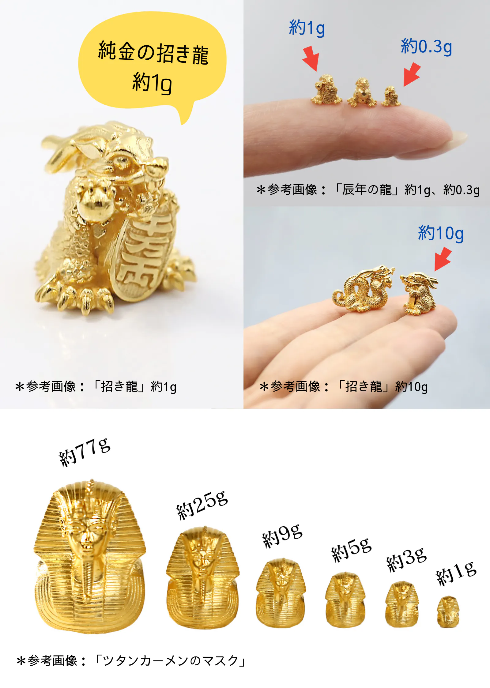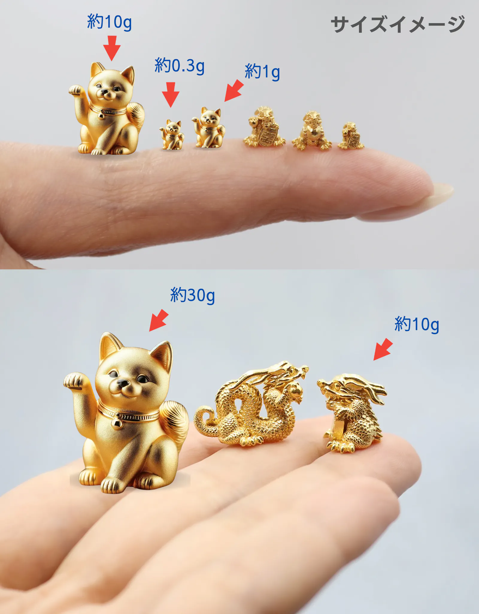 ◆純金の招き犬のサイズ感:モチーフタイプ 0.3g 1g 10g  30g