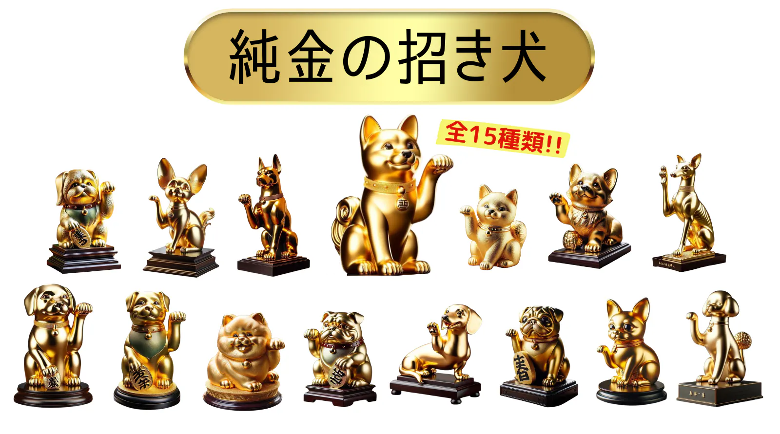 純金製品のJUNGOLDが企画した「幸運の招き犬」。15種類の、かわいい約1gの純金のわんこです。精巧でリアルなミニチュア純金。本物の純金をかわいく持つ体験、はじめませんか?