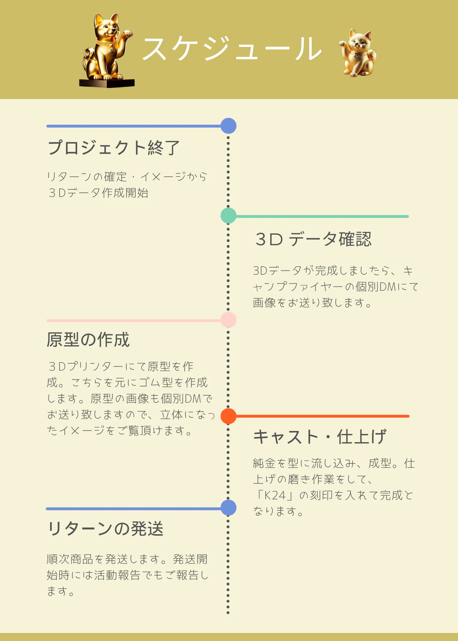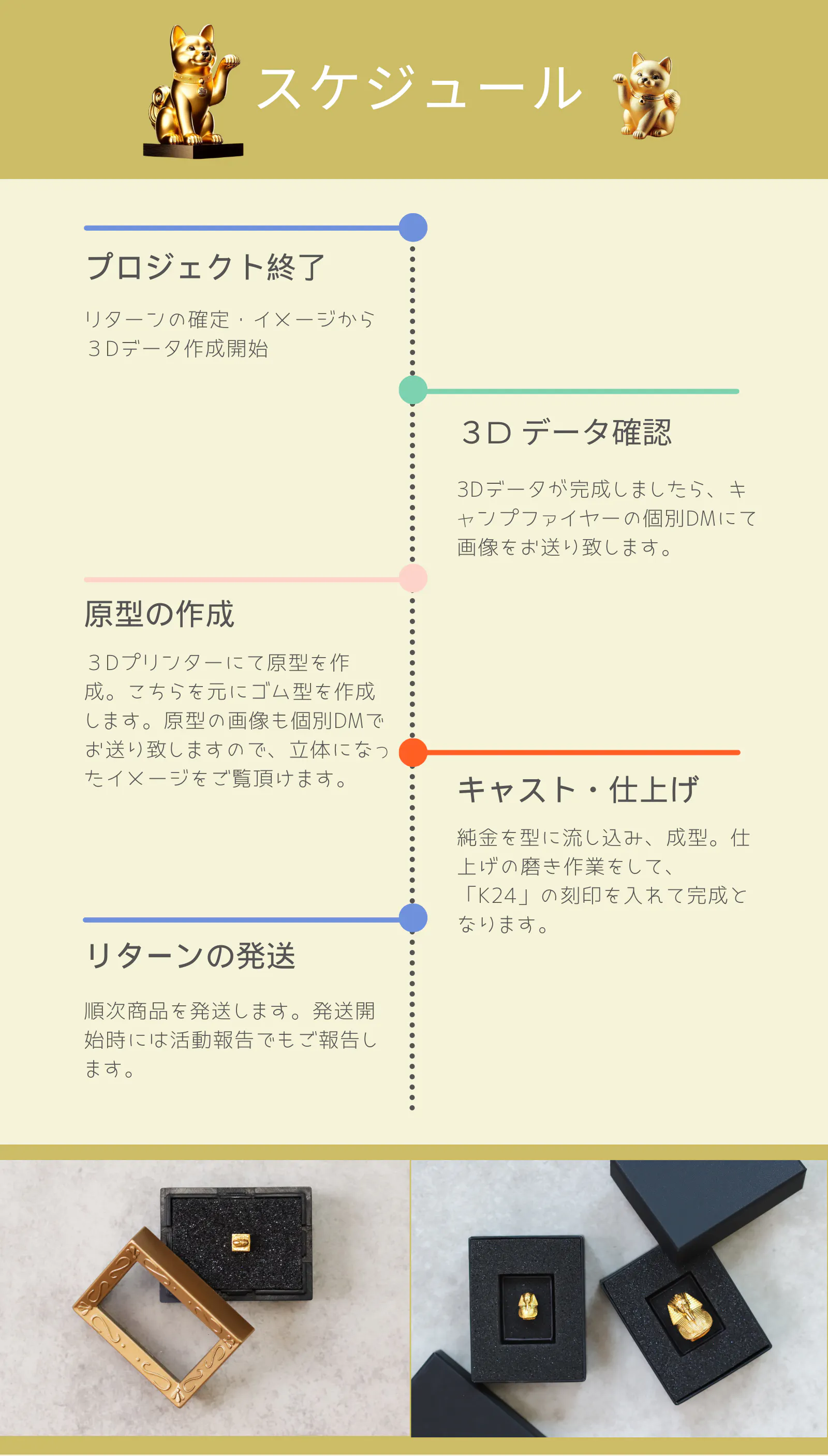 ➡できる限り、マメに活動報告や個別DMにて商品イメージをお伝えする。データやモックアップが出来た段階で画像等をお送ります。また、過去に作った純金商品をお見せしてイメージを伝える事もします。