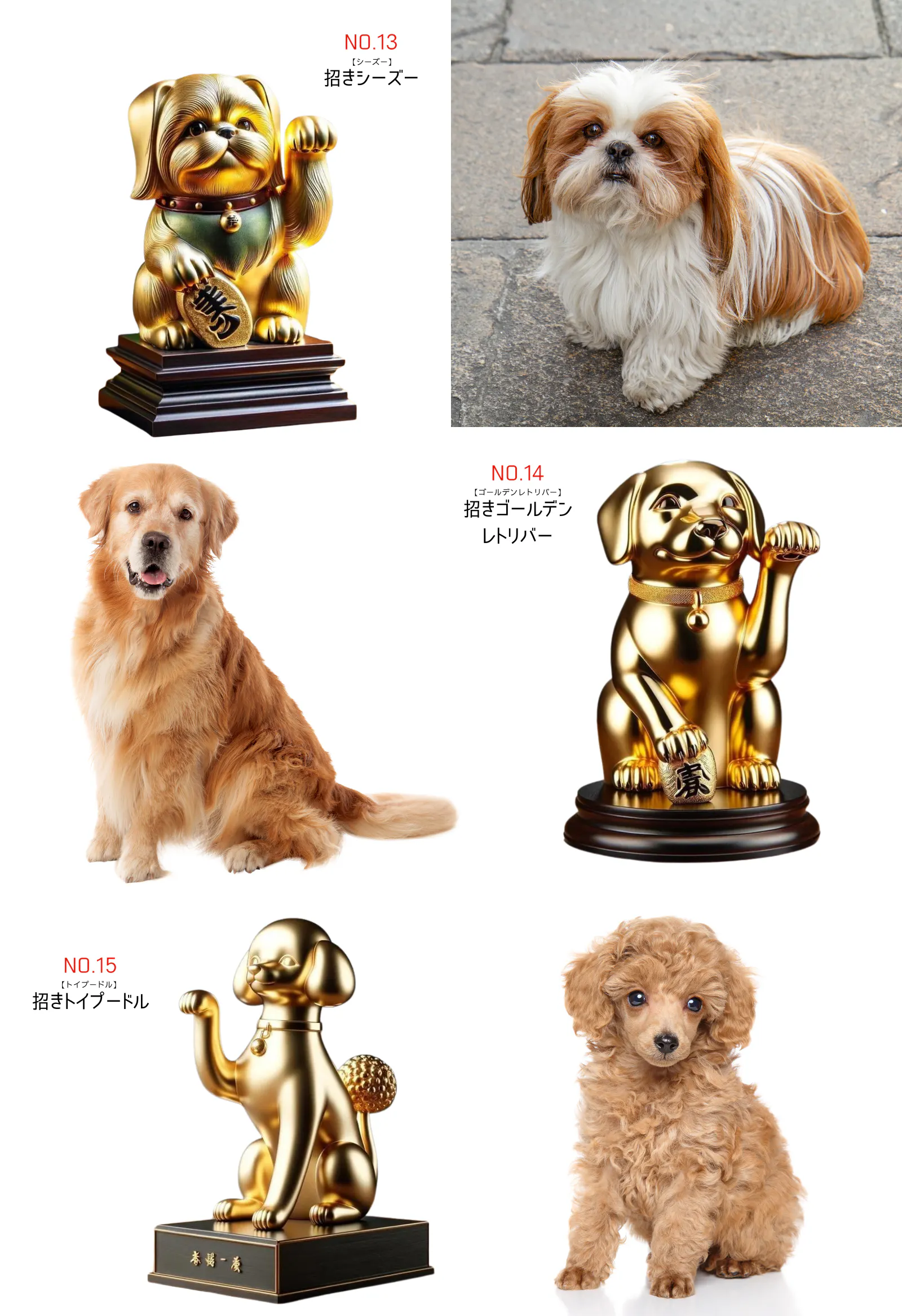 今回は15種類の「純金の招き犬」を作りたくプロジェクトを企画しました。以前より、招き猫があるのだから、招き犬があってもいいな、という発想から「純金の招き犬」の構想はあったのですが、犬は犬種によってかなり見た目も違うため、どの犬種にするか決めがたく、せっかくなので犬好きの方にも喜んでもらえるように、色々な犬種を揃えたい、という事で今回のクラウドファンディングのスタイルに至りました。