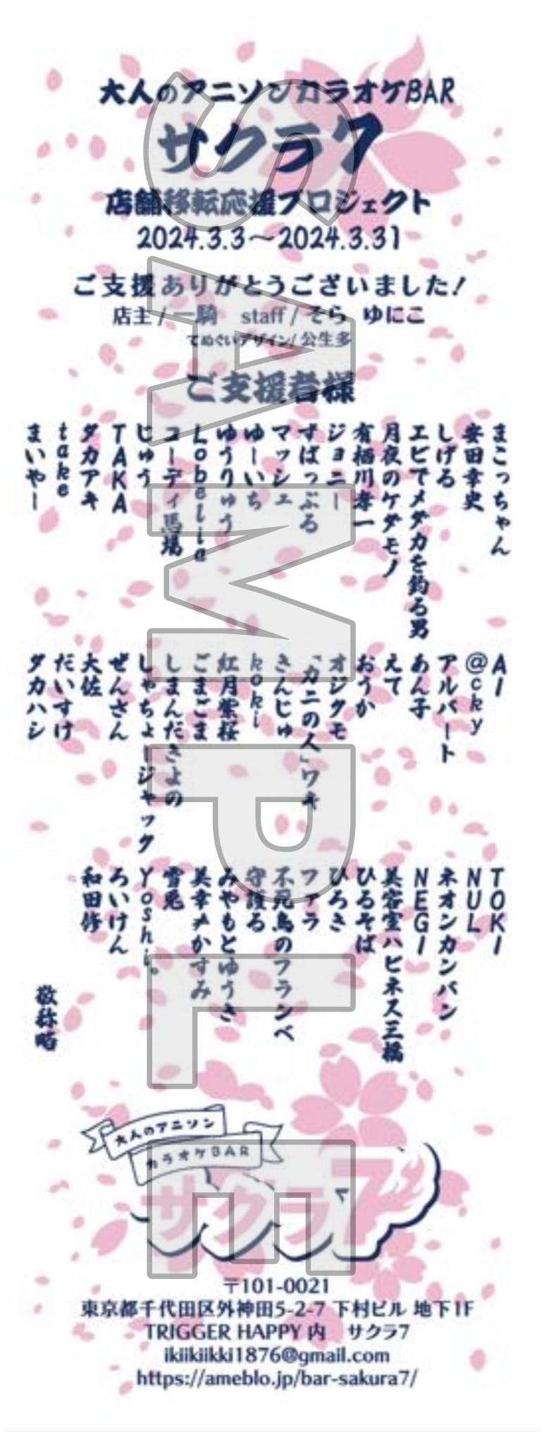 2024/04/27 17:184月26日(金)、クラウドファンディングの目標の一つ「折り畳み簡易ステージ」が搬入されました!まさかの数センチ奥行きが足りなくてエレベーターに乗らず、業者さんとヒイハア言いながら階段で下ろしました(涙)今も腕と腰と足に乳酸がめちゃくちゃ溜まっています。バッキバキです。同時に大阪にある「FirebomBAR」のマスター・デヴィウスさんから、等身大さくらさんのパネルを移転祝いに贈っていただきました!!ウッ、ウワ~~~~!!さくらさんに見守られながら歌を歌うことができるアニソンカラオケBARって、もしかしてサクラ7だけなのでは……ッ!?デヴィウスさん、本当にありがとうございます!そして設置して気付くこと。「ステージスカートが必要だったナ……」ありがたいことに皆様からのご支援がありましたので、そちらで購入させていただくことにしました。5月20日前後に到着予定です。クラファンでご支援くださった皆様や、日ごろからお店に遊びに来て応援してくださる皆様のおかげで、少しずつお店が立派になっていくのが、本当に嬉しいです。(あれ置きたい、これ置かせてくれと私のお願いを聞き入れてくださるトリガーハッピーのオーナーには、頭が上がりません……!)また、遠方で来られない方も、リポストなどで宣伝告知の手助けをしてくださるのが、とても心強いです!まだまだ知名度が低く、皆様にリポストしていただけて本当に助かっています。今後も是非、営業情報拡散のご協力をお願いいたします。大型連休、お近くにお立寄りの際は是非遊びにいらしてくださいませ! もっと見る