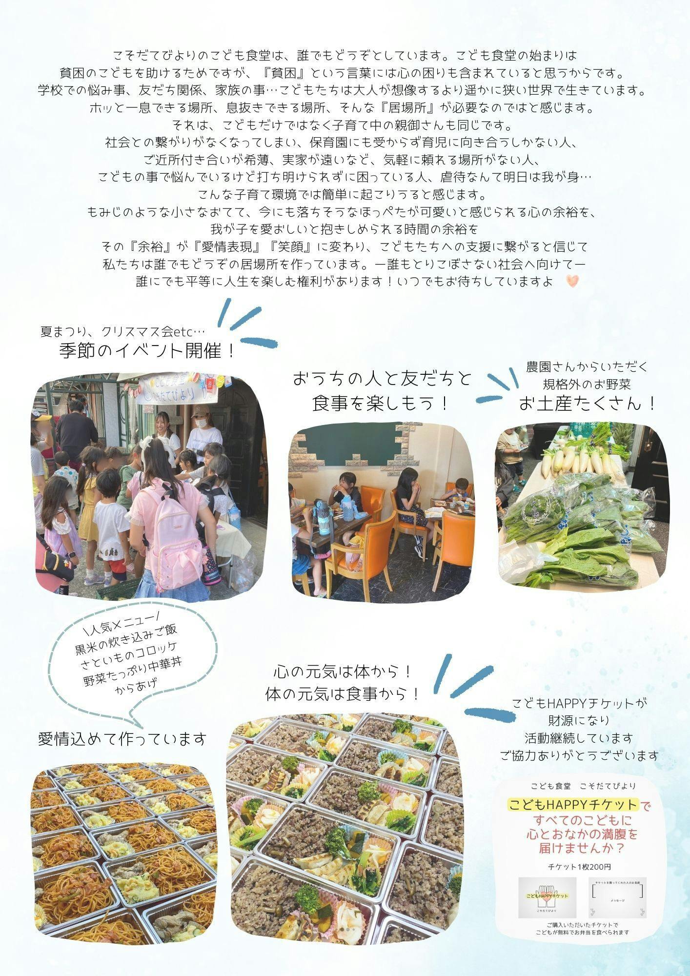 こそだてでよりのこども食堂は、誰でもどうぞとしています。こども食堂の始まりは貧困のこともを助けるためですが、『貧困』という言葉には心の困りも含まれていると思うからです。