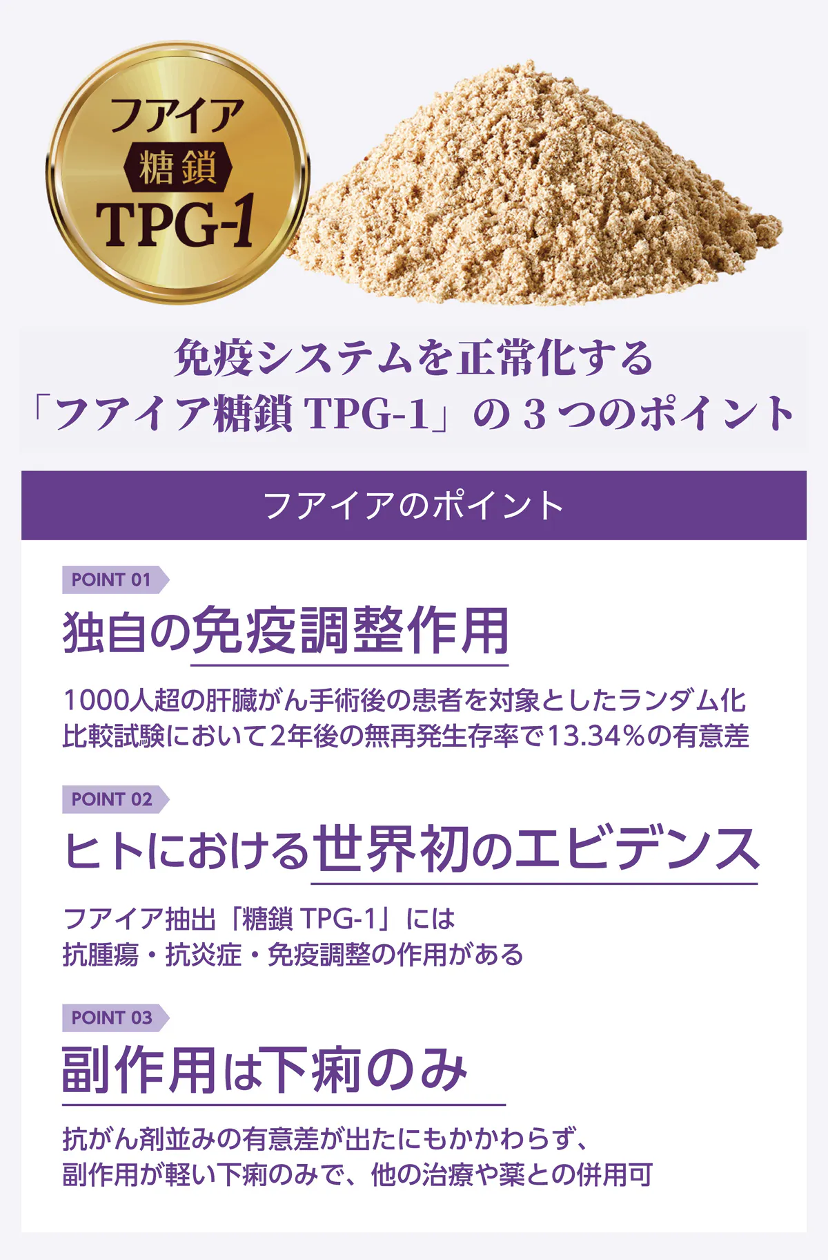 フアイア糖鎖TPG-1はヒトで免疫調整作用を持つことが知られており、免疫が落ちている個体の免疫を助け、免疫過剰になっている個体では免疫を抑えることにより効果を発揮します。近年犬や猫でも同様の効果があるとわかってきました。