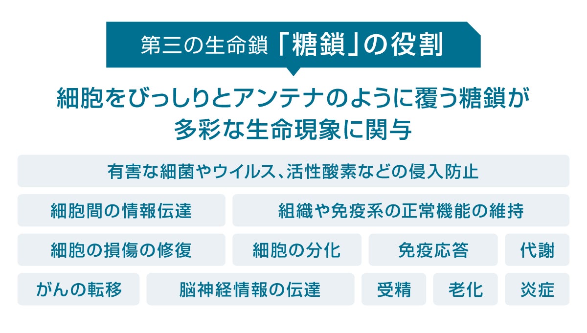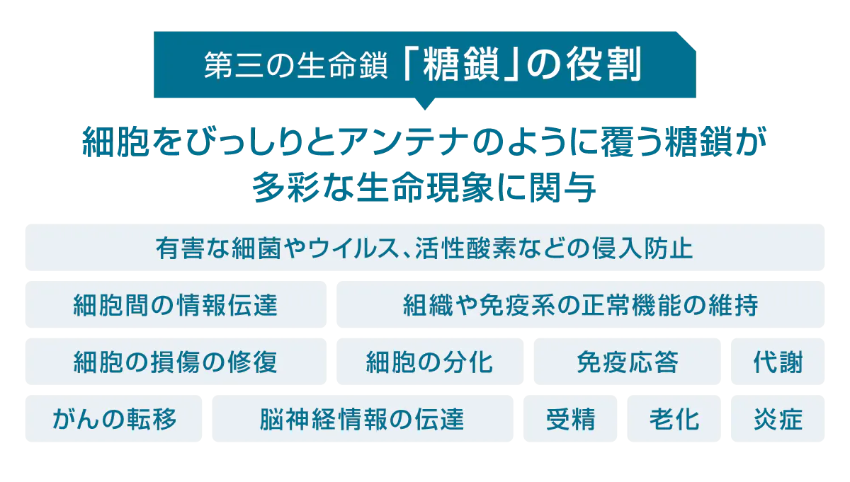 人の体は数十兆個の細胞から成り、第一の生命鎖(DNA)第二の生命鎖(タンパク質)と並び、第三の生命鎖である「糖鎖」に関心が集まっています。最近の研究で糖鎖の多様な機能が明らかになってきました。