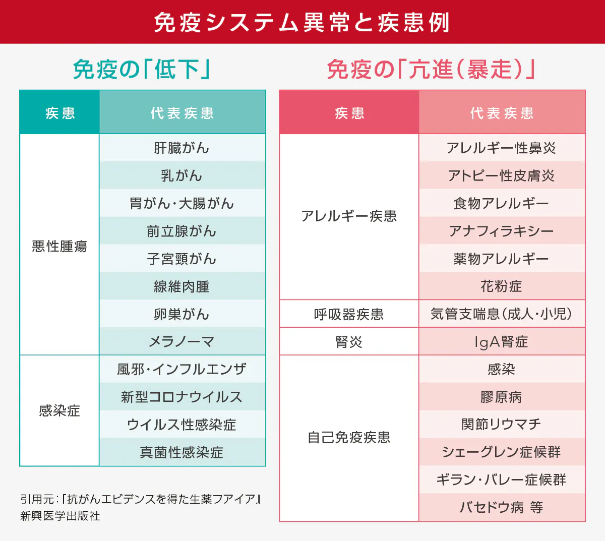 以下の表に、免疫と疾患の関係をまとめています。免疫システム異常が様々な疾患を引き起こしていることがご理解いただけるかと思います。