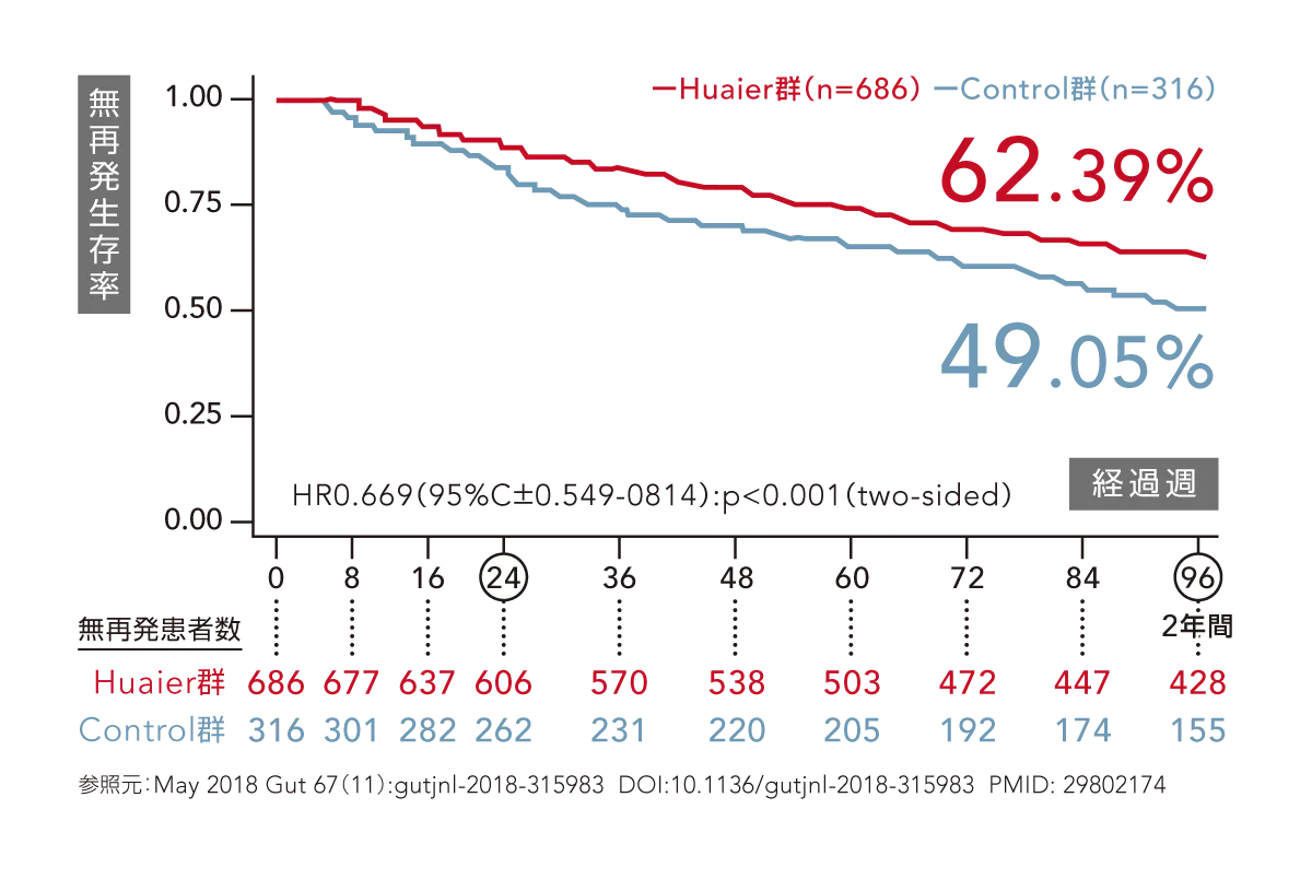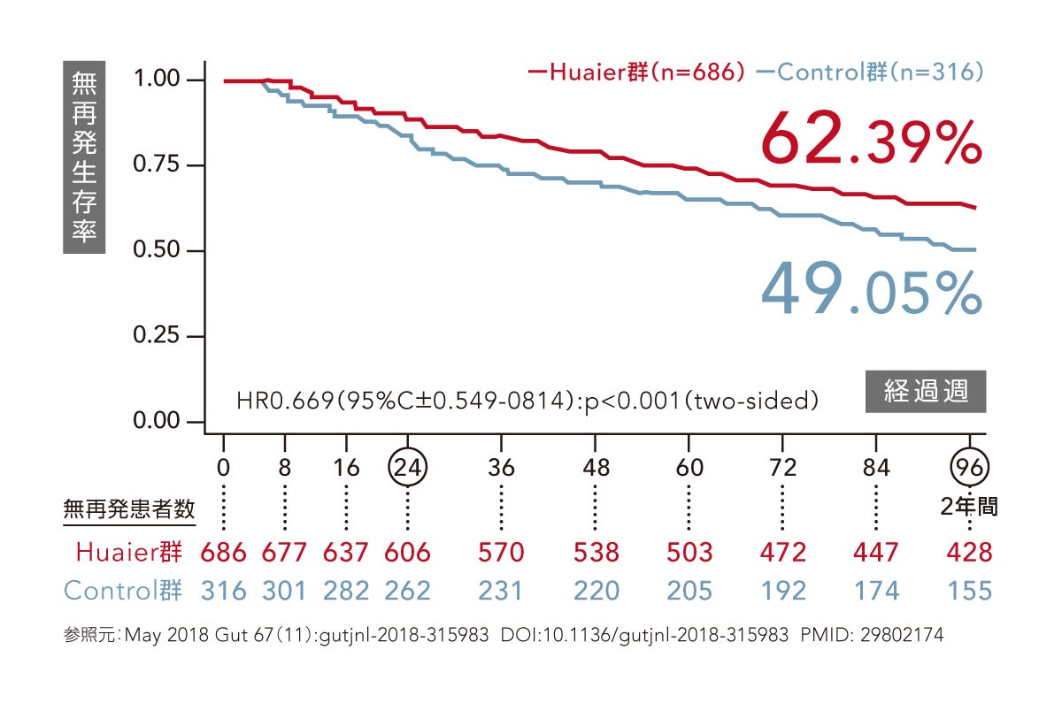 2018年、著名な英国の医学雑誌Gutにフアイアの抗がん作用に関する臨床研究が掲載されました。「臨床で1,000例規模に及ぶ肝臓がん手術後の患者に対しHuaierを投与し観察した結果、96週間後にHuaierを服用した群は、しなかった群にくらべて無再発生存率で明らかな有意差があった」という驚くべきものでした。