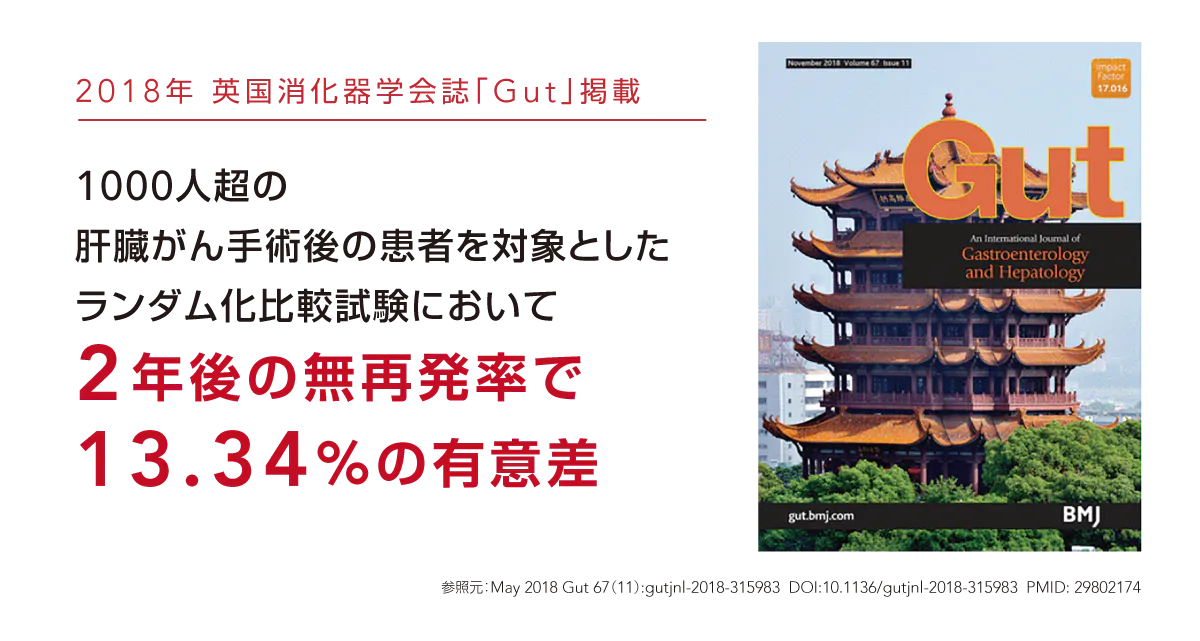 1000人超の肝臓がん手術後の患者を対象としたランダム化比較試験において2年後の無再発率で13.34%の有意差