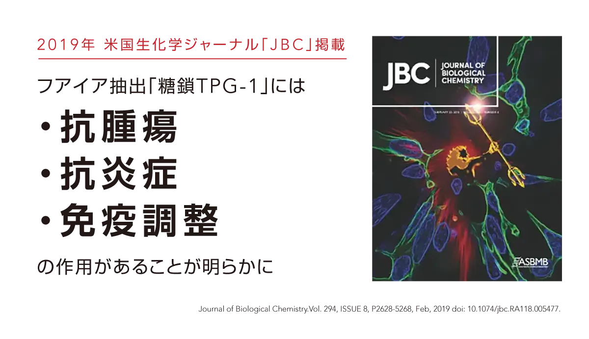 それが、生薬フアイアに含まれる「糖鎖TPG-1」という成分です。2019年に超一流の米国生化学ジャーナルJBCに掲載された研究論文によればフアイア菌糸体抽出物から糖鎖の一種「TPG-1」という新しい成分を発見し、その成分と驚くべき効果を解明したと報告されました。フアイア抽出糖鎖TPG-1には抗腫瘍、抗炎症、免疫調整の明らかな作用が認められたことが報告されました。