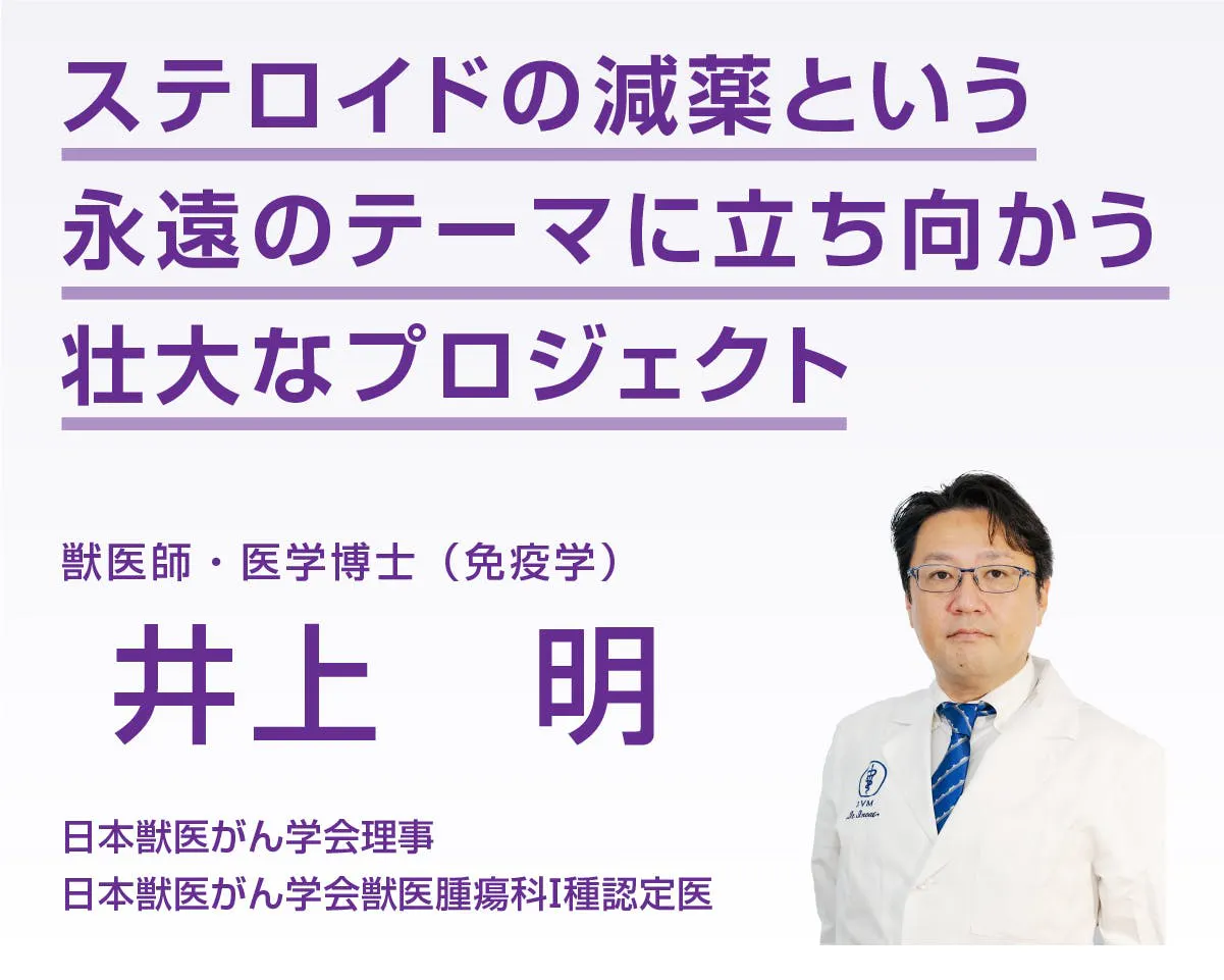はじめまして、井上明と申します。私は獣医師として臨床経験を積み、日本獣医がん学会獣医腫瘍科認定認定医(Ⅰ種)となり、帝京大学医学研究科の博士課程で免疫学を学び、博士号を取得しました。現在、全国の動物病院で腫瘍科のセカンドオピニオンとして活動しています。その中では、ステロイドによる長期的な治療を必要とするものがあり、副作用に苦しむ犬猫の姿にペットオーナーは心を痛めながらも、立ち向かう場面が多々あります。