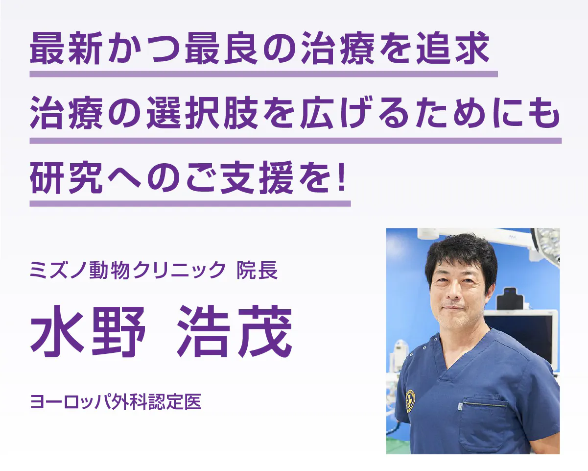 ミズノ動物クリニックの院長、水野浩茂です。久末正晴先生のクラウドファンディングを応援します。