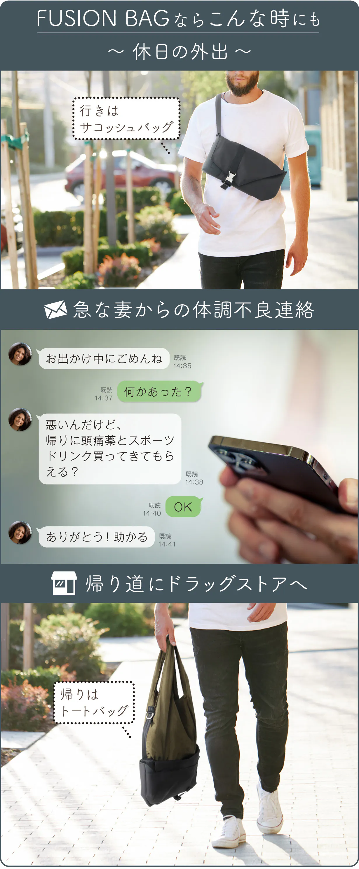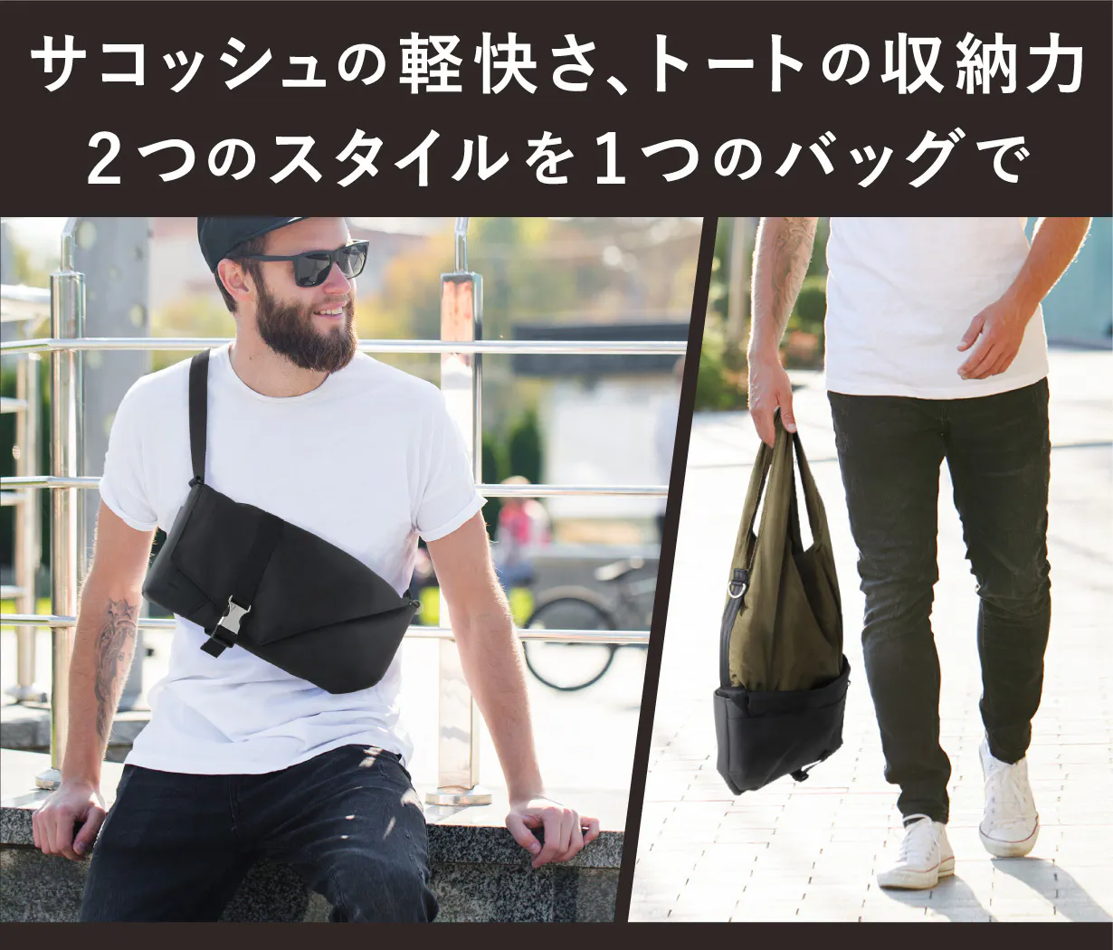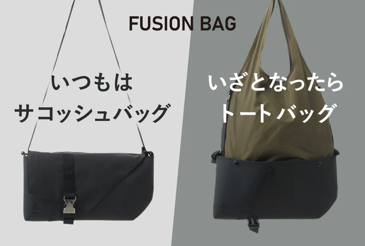 出かける時はできるだけ身軽に。『フュージョンバッグ』は、普段サコッシュバッグとして使いつつも、出先で荷物が増えた時にトートバッグとして使うことができる「サコッシュ」と「トート」2つのバッグを融合(フュージョン)した新しいバッグです。