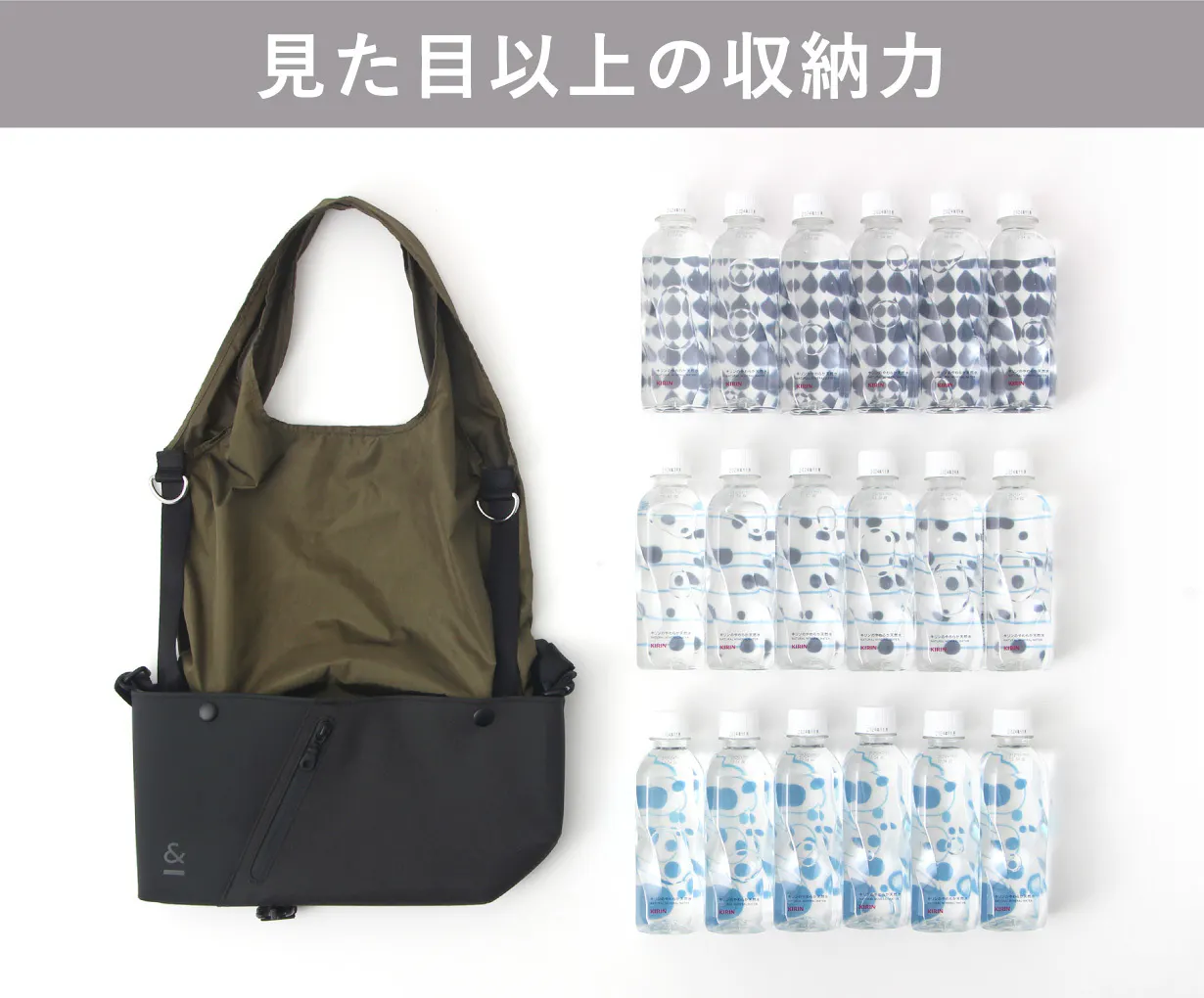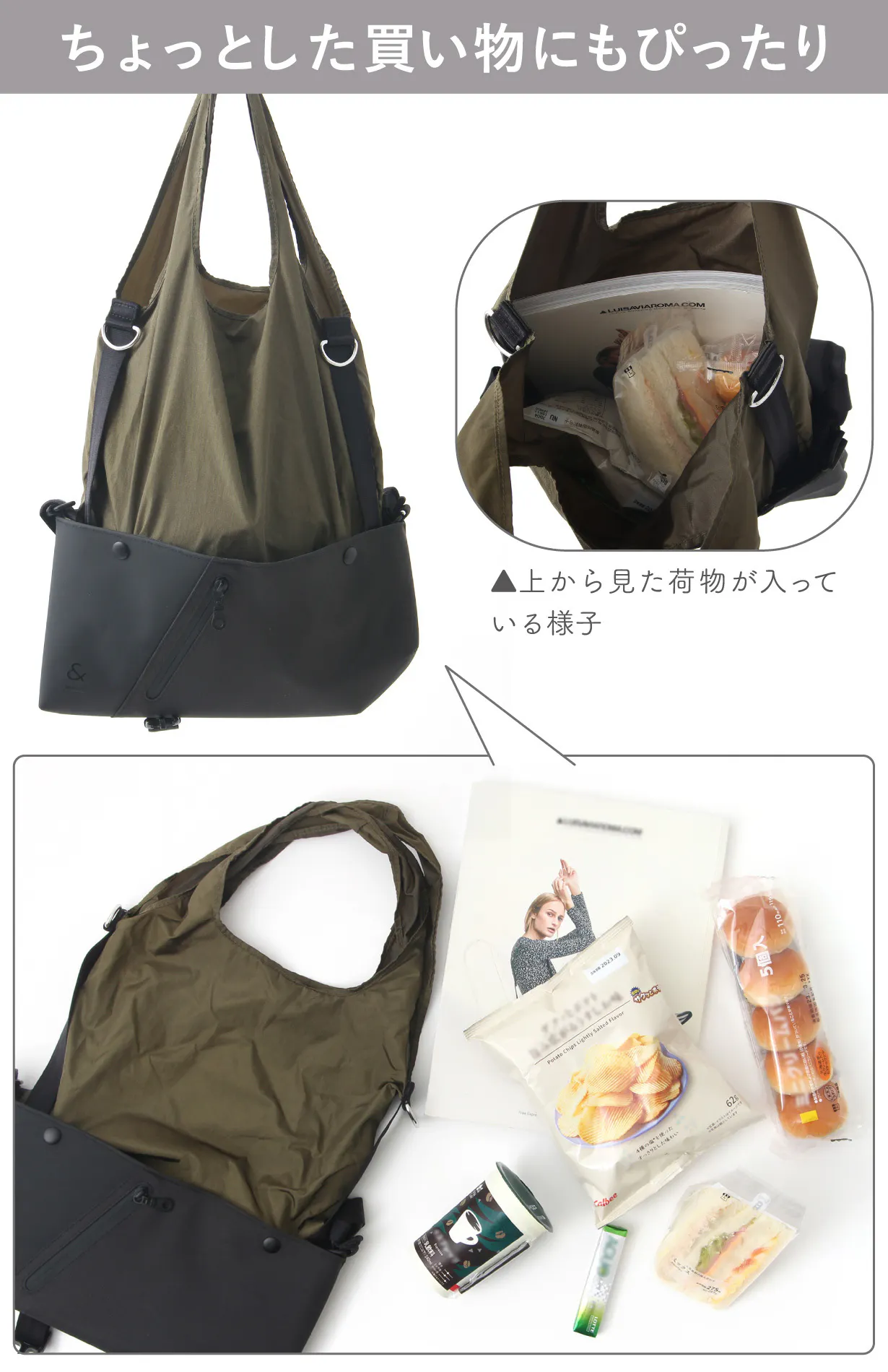 予定外の買い物でも、トートバッグの収納力でレジ袋いらず。脱プラスチックに貢献でき、レジ袋を買う余計な出費もなくなります。