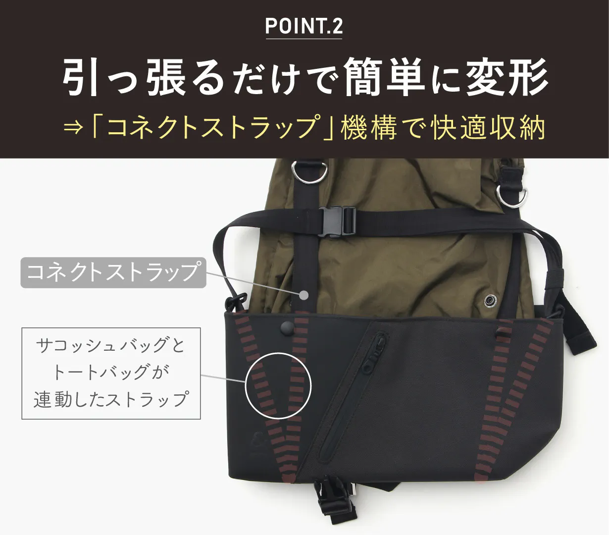 「コネクトストラップ」は、サコッシュバッグとトートバッグに繋がった「引っぱるだけでサコッシュバッグからトートバッグにスマートな切り替えを実現」する独自機構です。トートバッグ変形時はストラップが自動収納、逆にストラップを引っぱるとトートバッグの袋が自動収納されます。※特許出願中