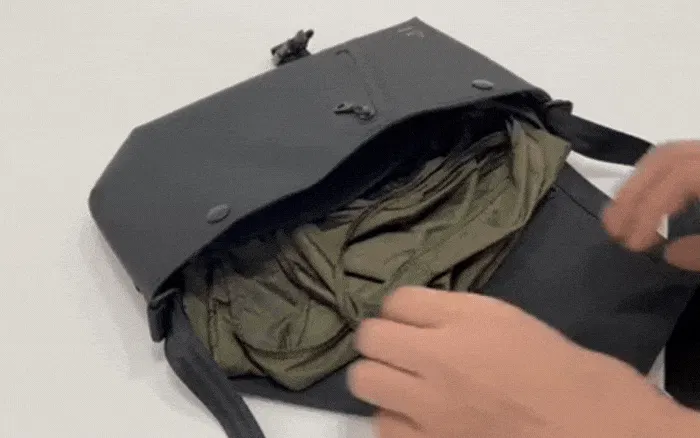 サコッシュバッグ時のストラップがトートバッグの袋部分と繋がっているので、ストラップを引っぱると、自動的にトートバッグの袋が収納されます。