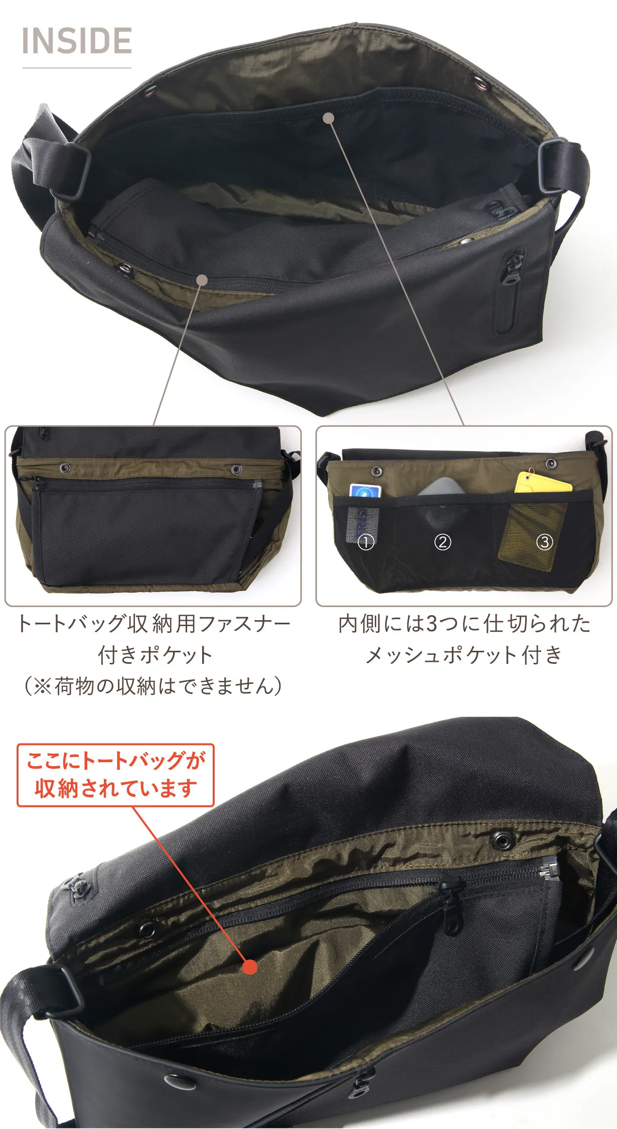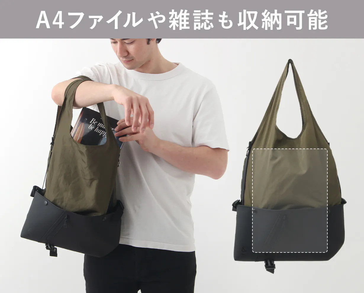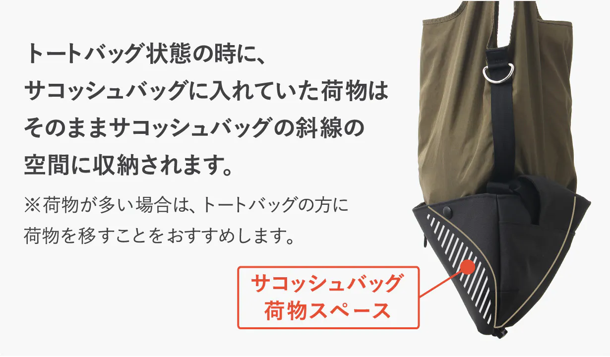 トートバッグ状態の時は、サコッシュバッグの間口がマチ代わりになり、荷物をより多く収納できます。