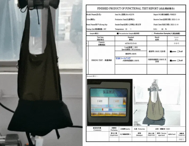 1Kgの荷物を入れた状態で1500回の上下運動をする耐久テストで製品の耐久性を確認しています。