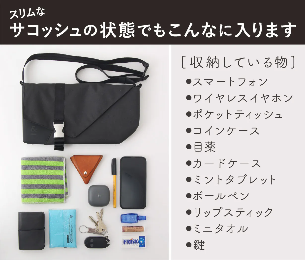 FUSION BAGは、普段持ち歩く荷物が少ない人にもおすすめ!よく使う必要なものだけ収納するのに丁度いいサイズです。