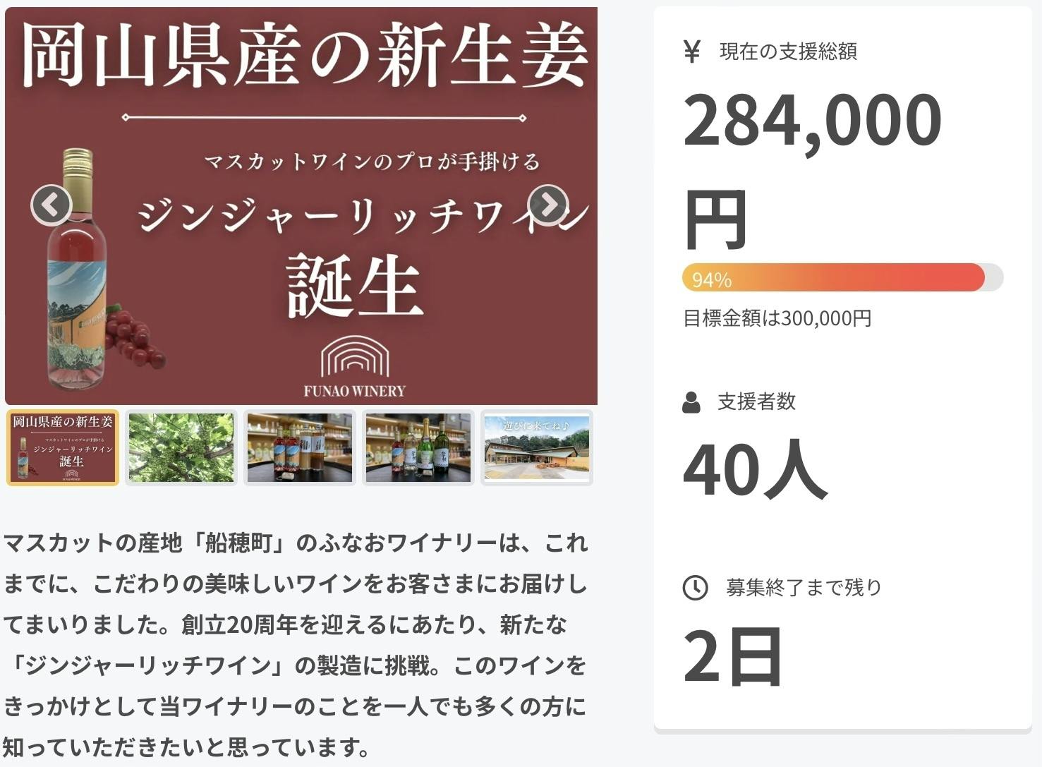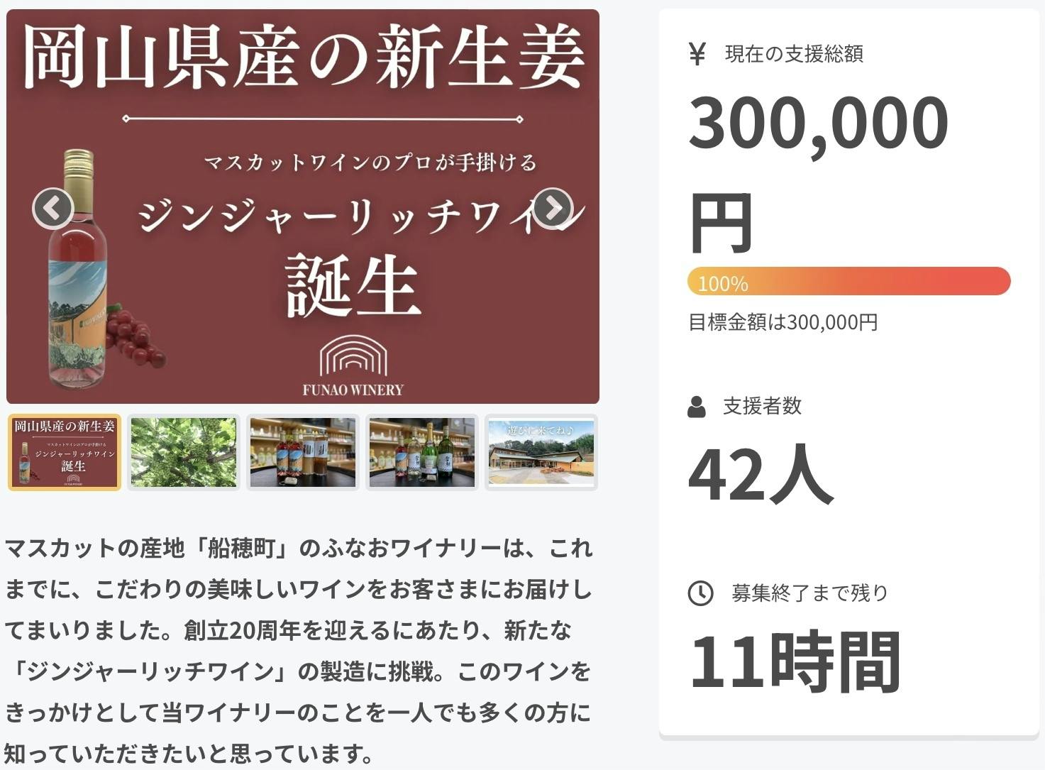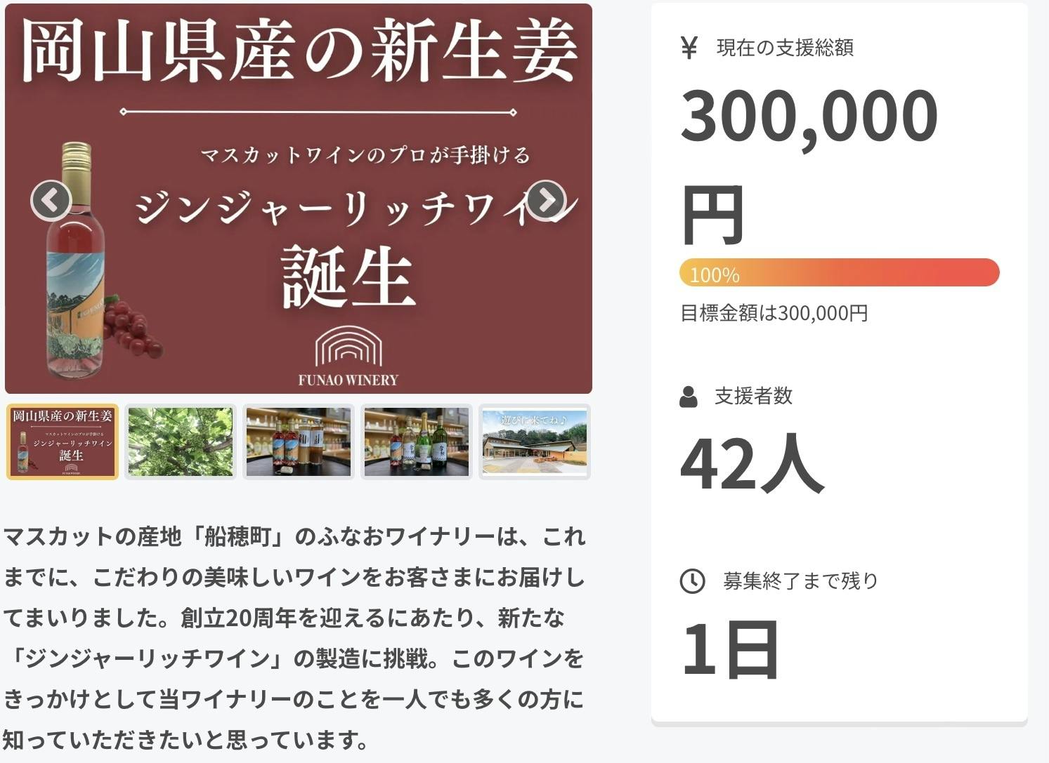 2024/05/30 15:18皆様のご支援、ご協力のおかげでついに達成率100%になりました!!!!最終日目前ですが、無事に100%を迎えることができてふなおワイナリー従業員一同嬉しく思っています!!県外の方も多く支援してくださり、目的も達成されつつあると実感しています。ここで満足せず、最後まで走り抜きます!!最後まで引き続きよろしくお願いいたします!! もっと見る