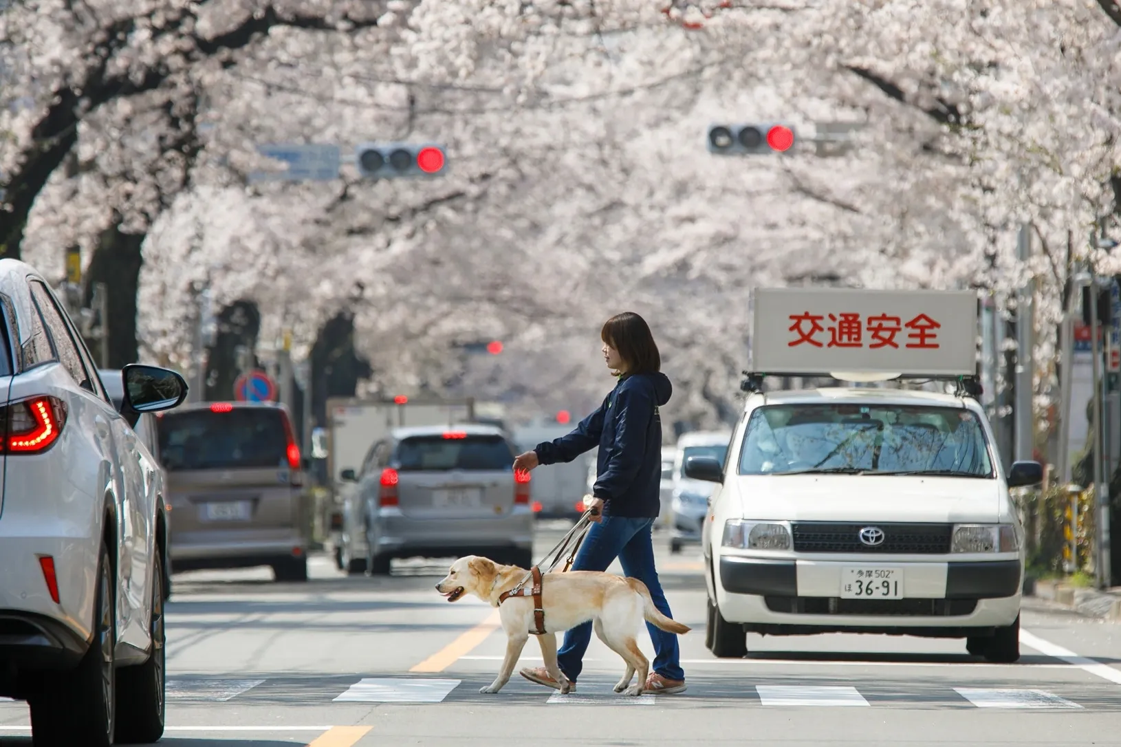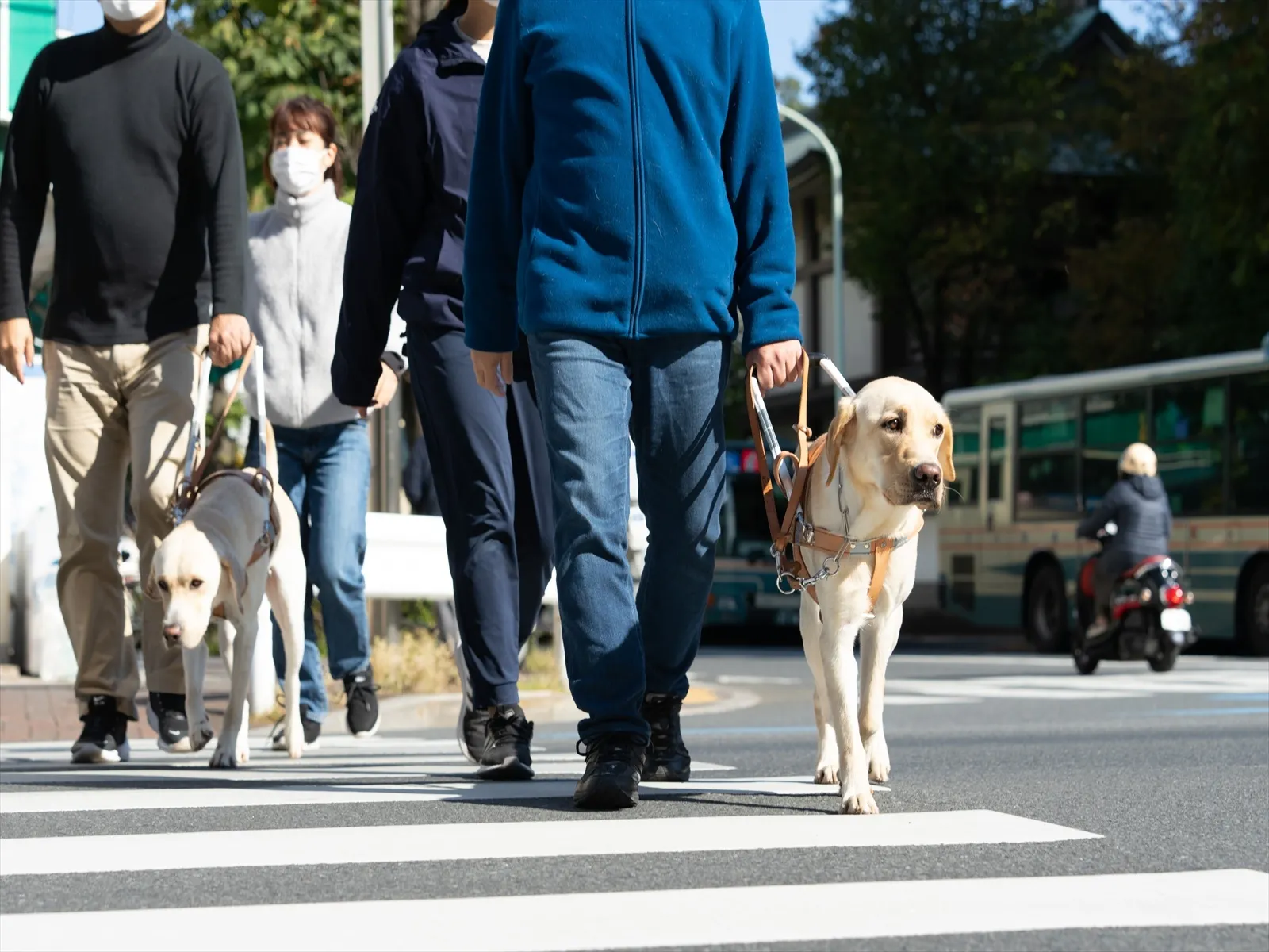 歩行指導を受けた視覚障害者が指示を出し、その指示に従ってアイメイトが誘導するという、人と犬の協同作業によって初めて安全な歩行が実現します。