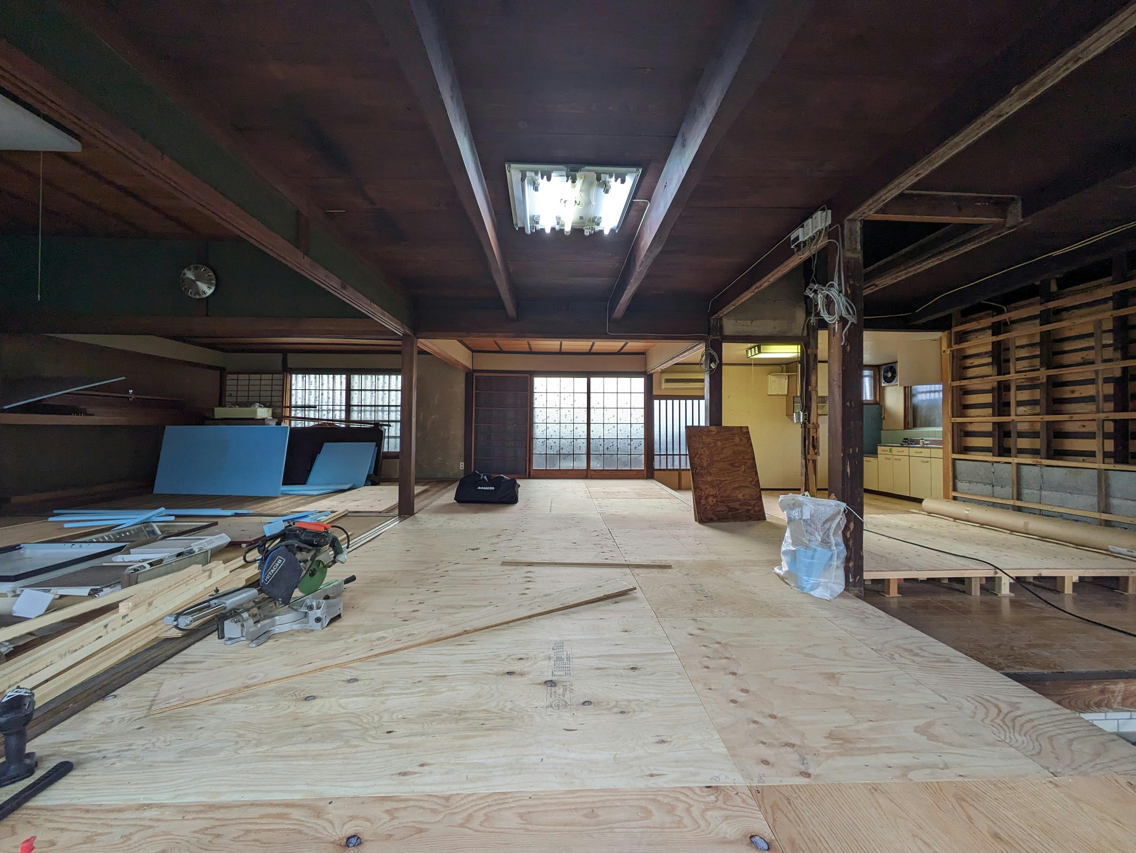 2024/04/03 00:03皆様、こんにちは!ご支援いただいた方々、本当にありがとうございます!今回は、客席になるエリアです♪古民家なので床から熱が逃げるためしっかりと断熱材を施工し、合板下張りが完了いたしました!この上にシックで暗めなフローリングで仕上げる予定です。古民家の趣ある空気感と、シックなフローシングで落ち着いた空間で焼鳥とお酒を存分に楽しんでいただければと思います♪写真の右奥がキッチンですが、そこを囲むようにL型カウンターが造作されます。徐々に完成に近づいていく様子も楽しんでください♪今後とも応援のほど、何卒よろしくお願い致します! もっと見る