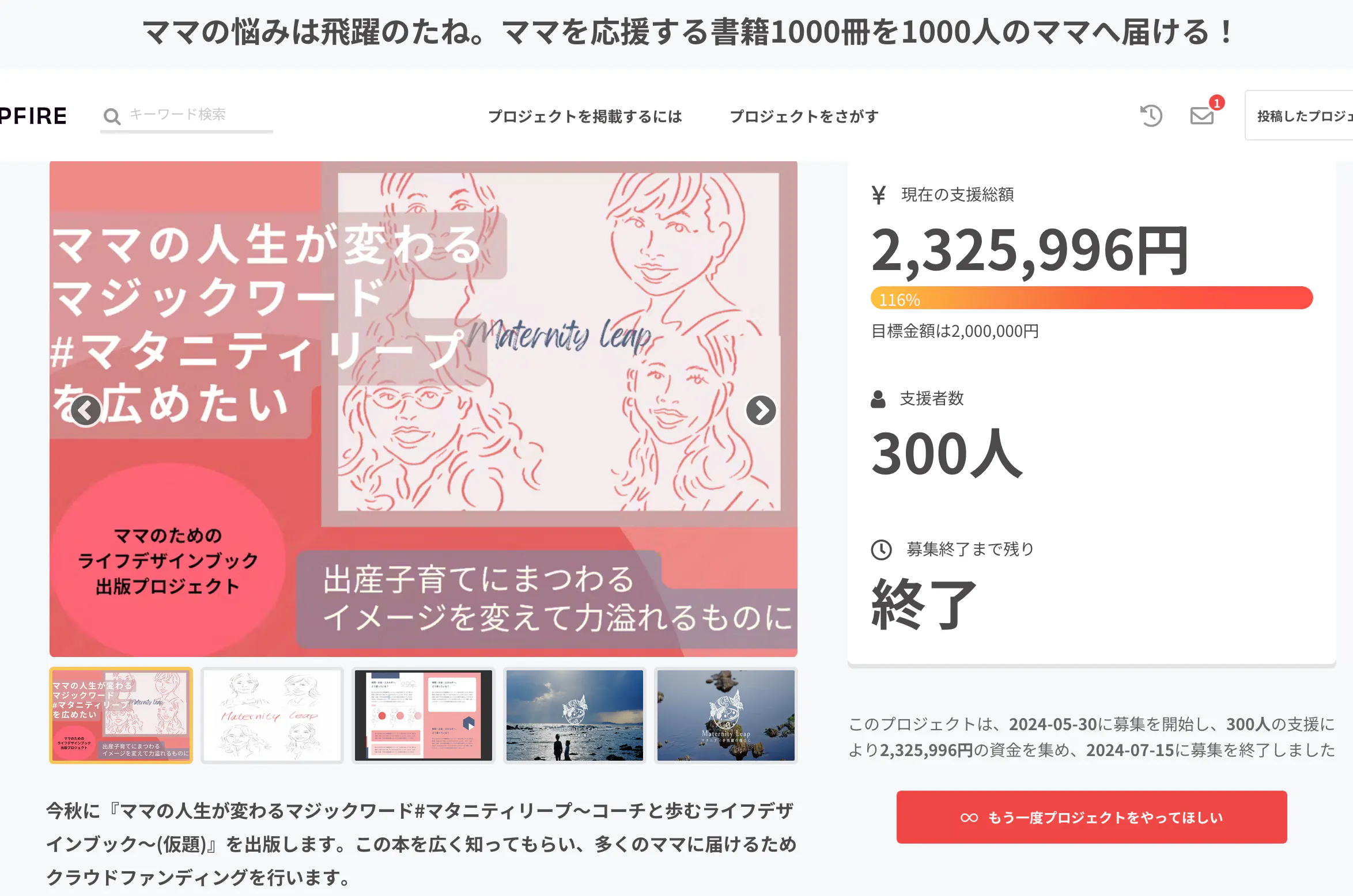2024/07/16 11:28こんにちは、マタニティリープです。皆さん、こんにちは。この度は「マタニティリープ」出版プロジェクトに心からのご支援をいただき、本当にありがとうございました。昨日クラウドファンディング期間が終わり、皆さまのおかげで、私たちのクラウドファンディングキャンペーンが無事に目標を達成し、なんと目標金額2,000,000円を超える2,325,996円もの支援を集めることができました!支援者の数はぴったり300人!本当に、本当にありがとうございます。おかげさまで秋の出版に向けて、私たちはこれからも一層力を入れてプロジェクトを進めていくことができます。一緒にさらに大きな夢を形にしていけることを嬉しく思います。*リターン品についてのお知らせリターン品の準備が整い次第、皆さまには個別にご連絡を差し上げます。もう少々お時間をいただきますが、素敵なリターンが皆さまのもとへ届くよう、全力を尽くして準備中ですので、今しばらくお待ちくださいね。このプロジェクトを通じて、皆さまとさらに深いつながりを持てたことを嬉しく思います。今後のアップデートもどうぞお楽しみに!心より感謝を込めて。マタニティリープなべゆきみわにゃんちなつひぐまり もっと見る