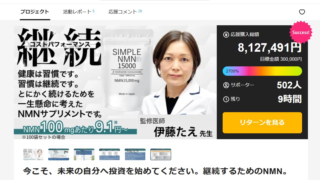 無事に目標金額を達成しました!! SIMPLE NMN 15000 無事にMakuakeキャンペーンをスタートしております。