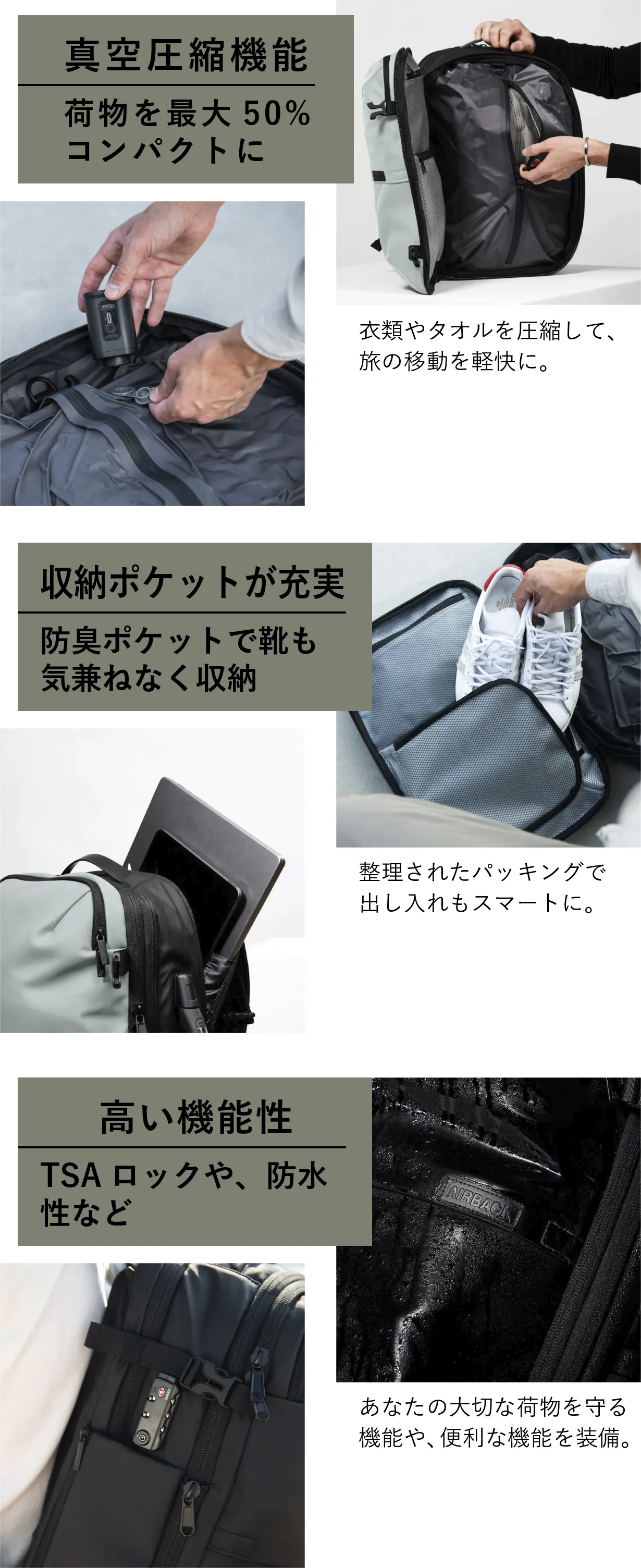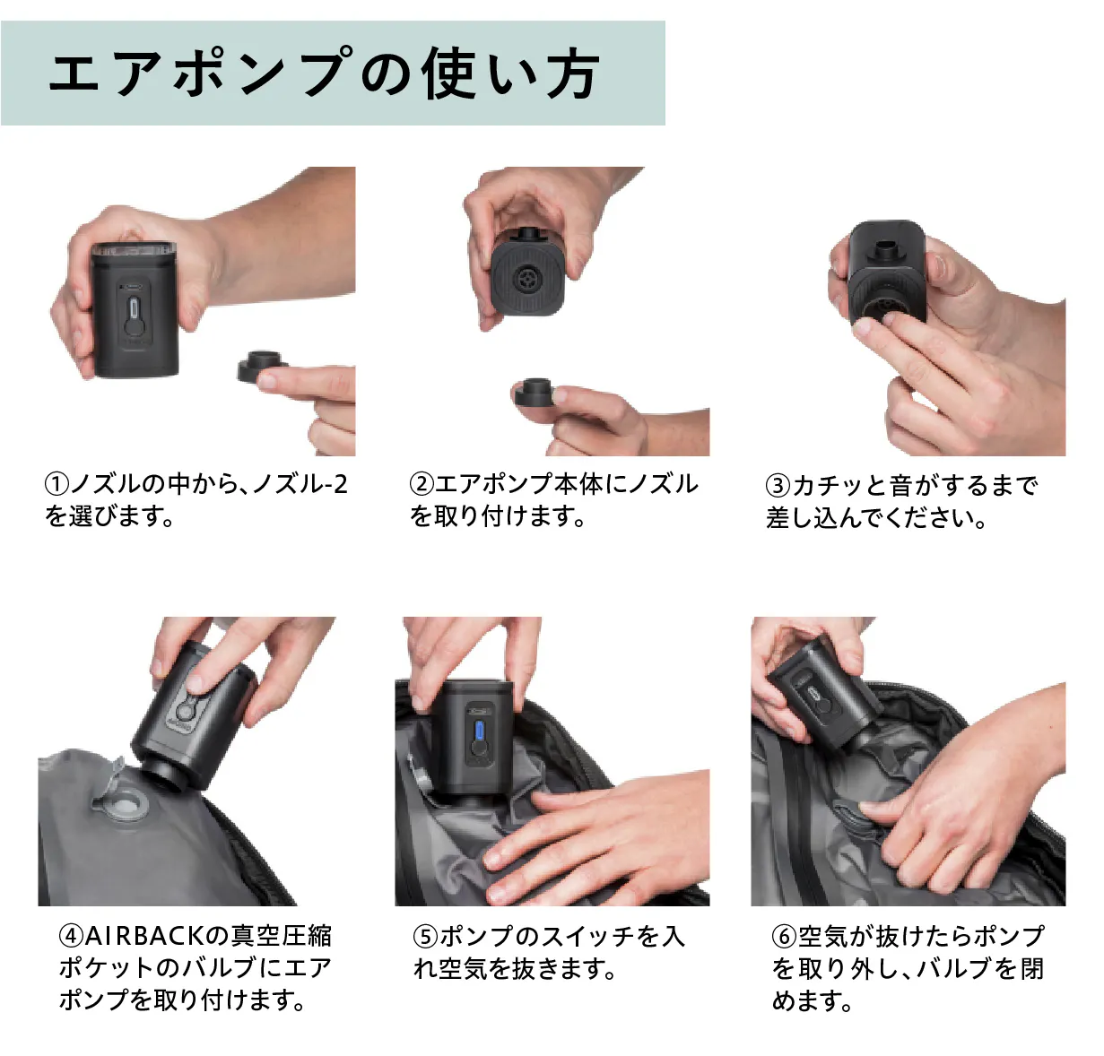 ※旅先でも荷物を圧縮したい場合はエアポンプ(オプション品)をご一緒にお求めいただくと便利です。
