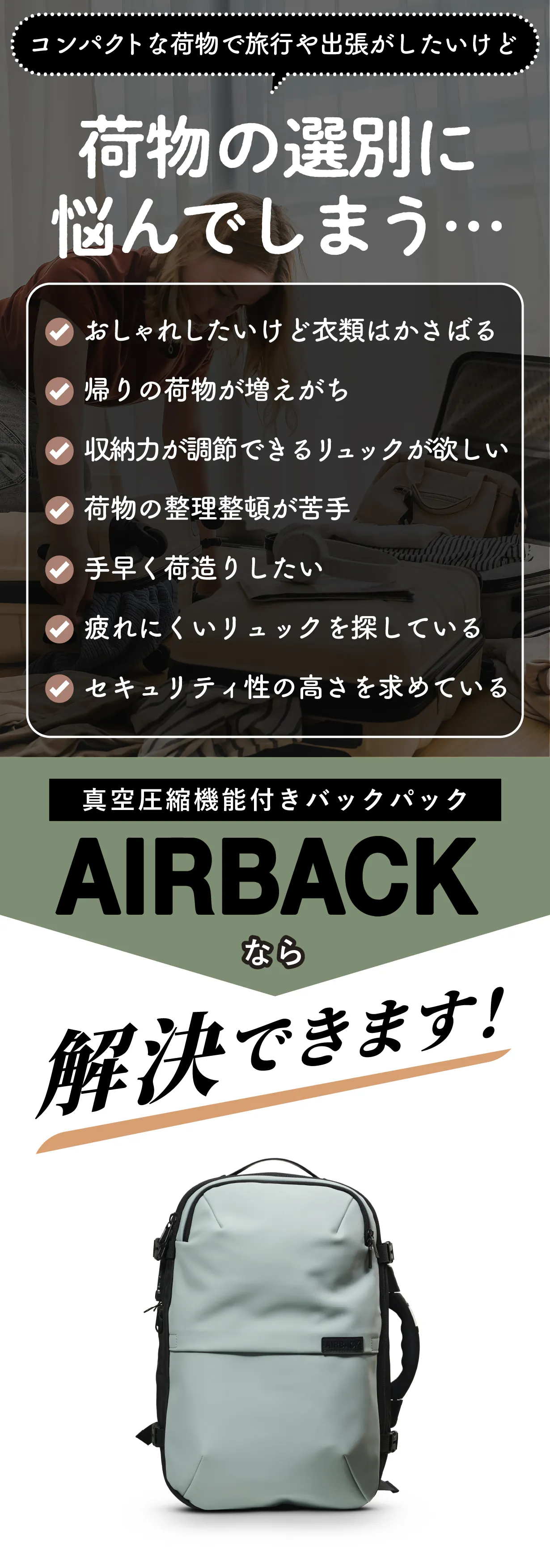 私たち、Airback BVのメンバーは、皆さんと同じく、私たちも旅行の困難に直面しながら、道中や空の旅で数えきれないほどの時間を過ごしてきました。荷物の詰め込みに苦労し、重量制限を超えるストレス、旅行の不便さと常に戦ってきました。私たち自身が経験者だからこそ、あなたの不満がよくわかります。そんな経験から、私たちは夢を持ち、設計を重ね、ついには真空シールシステムを内蔵した革新的なバッグ、AIRBACKを生み出しました。
