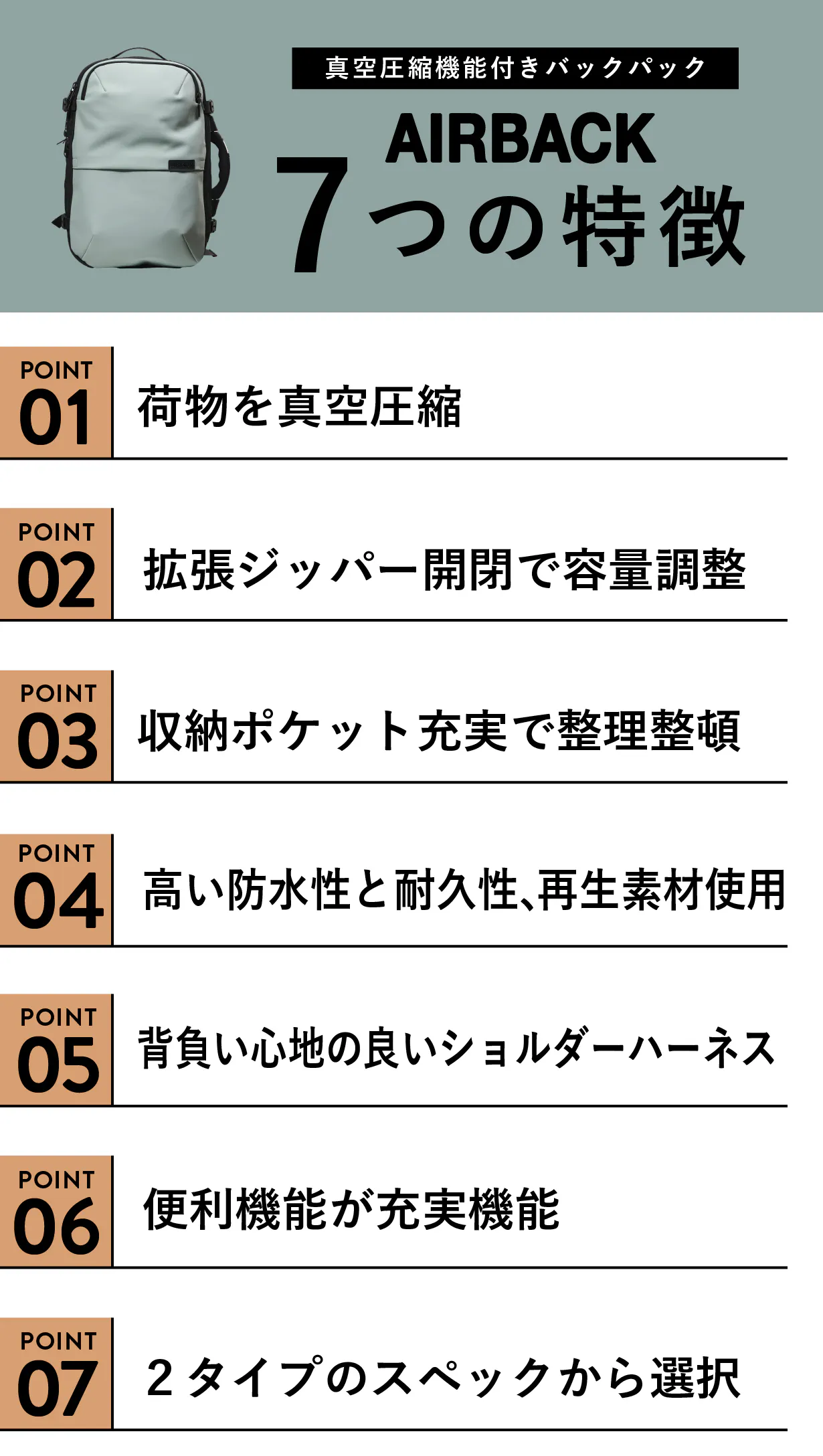 世界に散らばる新しいユニークな製品を探す中で、私たちは、旅行のストレスを軽減し、より快適な体験を提供できるバックパック「AIRBACK」に出会い、その革新的な真空圧縮技術が、荷物の詰め込みに苦労し重量制限に悩む旅行者のために役立つと確信し、このバッグを日本市場に紹介することが私たちの使命だと感じました。旅の自由度を高めることで、より多くの人々に新しい旅行体験を提供したい、旅行の楽しさと快適さを皆さんにお届けしたいと考えています。