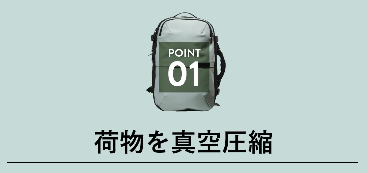 パッキングした荷物を約50%縮小することが可能な真空圧縮システム。ご家庭にある掃除機で、空気を吸い出して圧縮することができます。