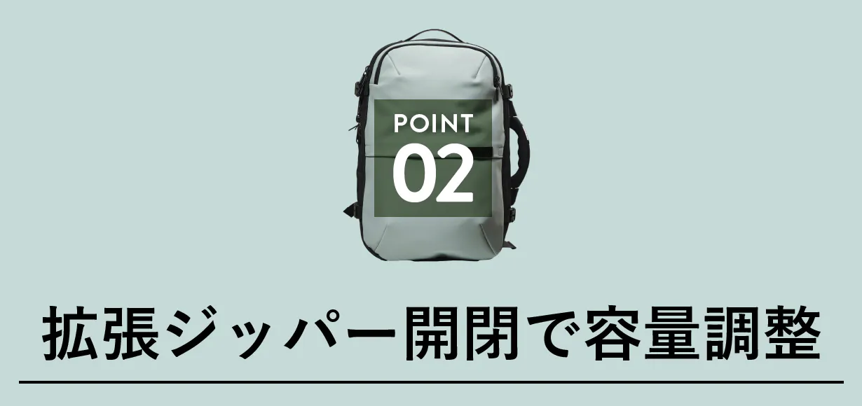 サイズ拡張ジッパーがついています。荷物の容量に合わせて開閉してお使いください。