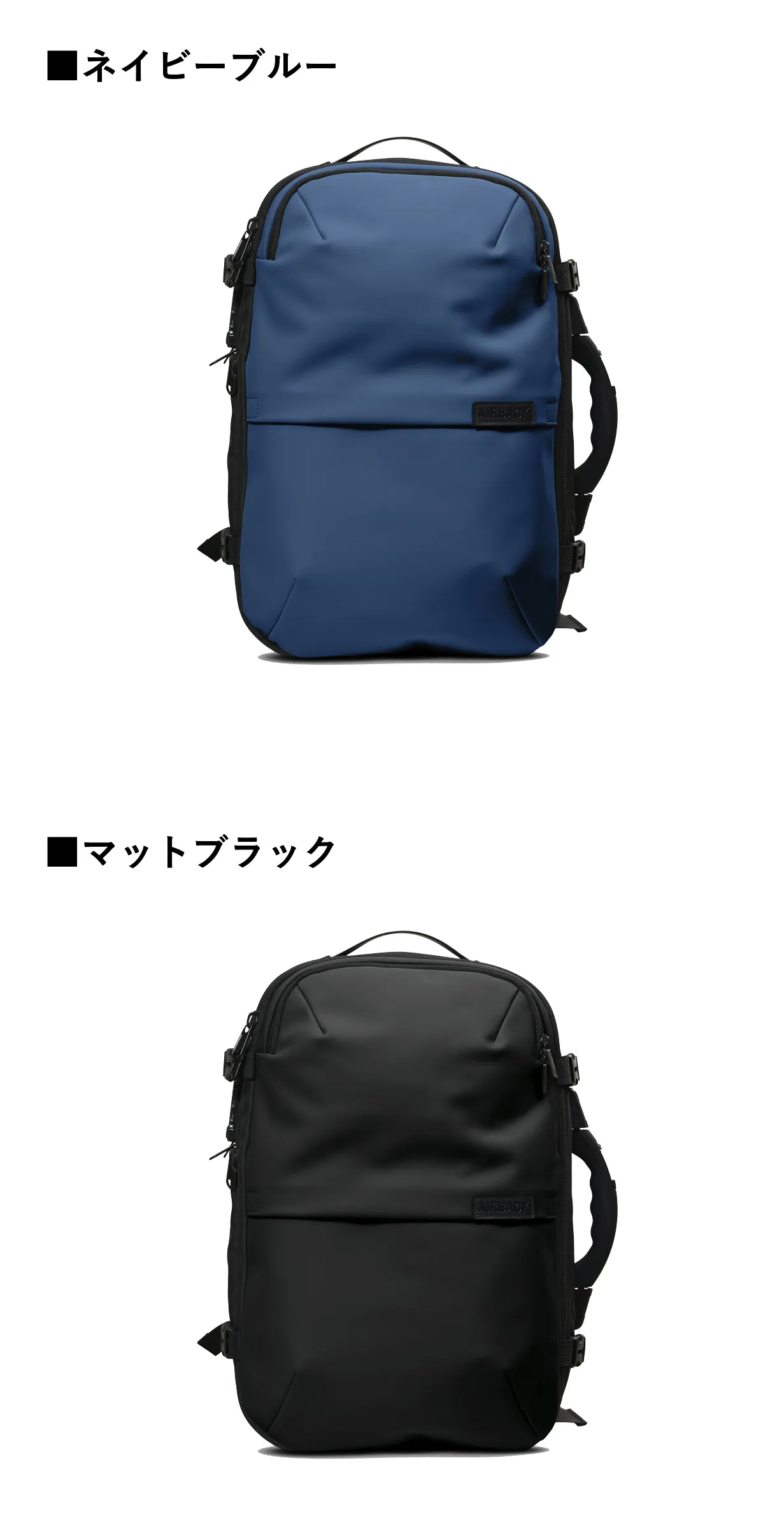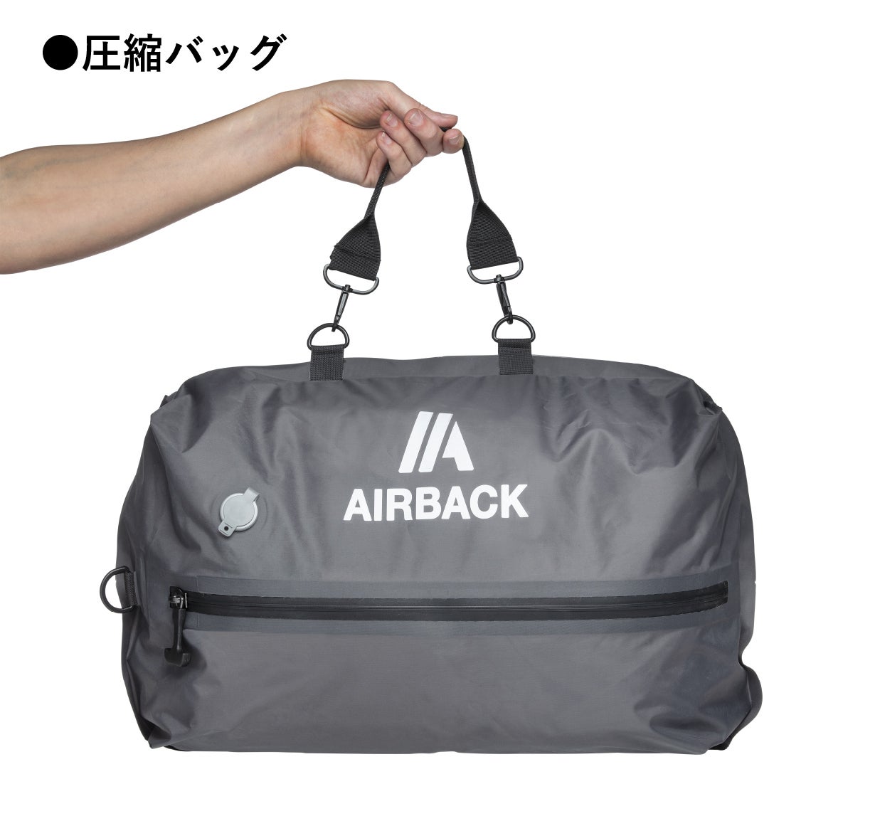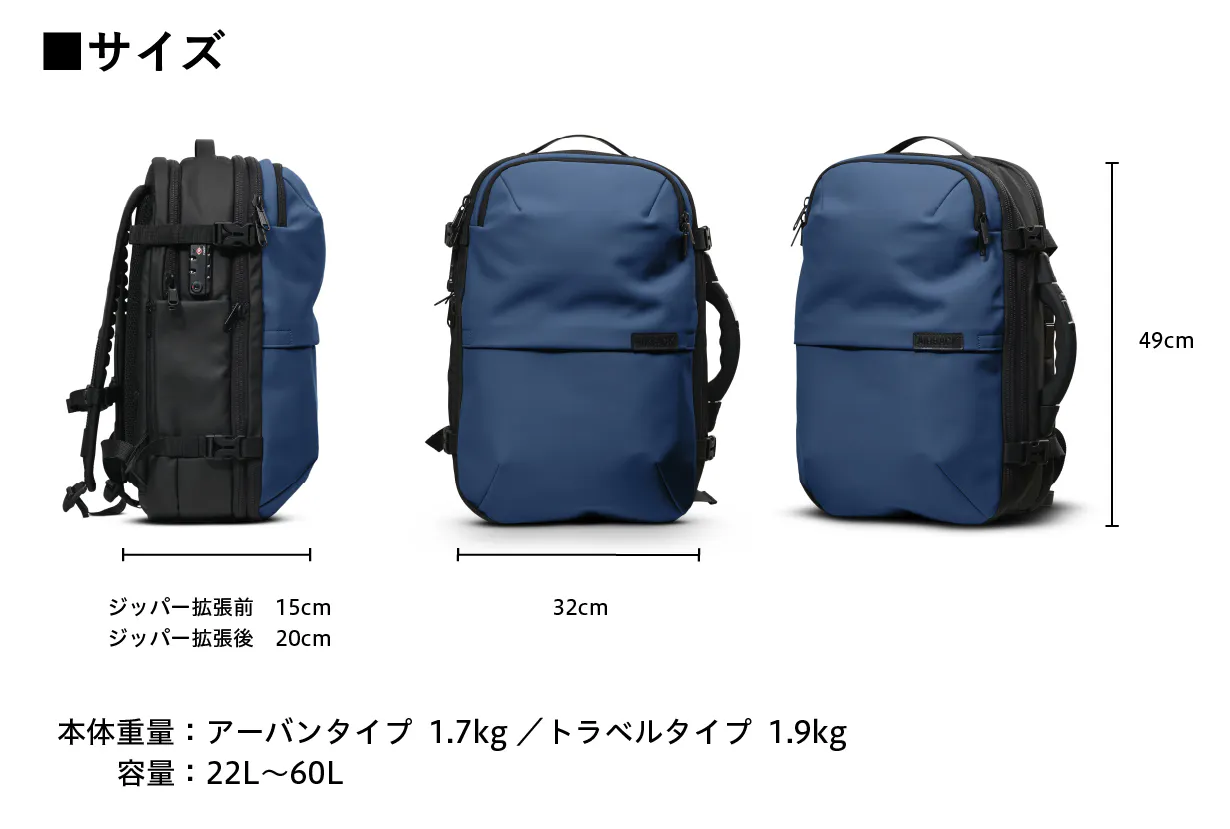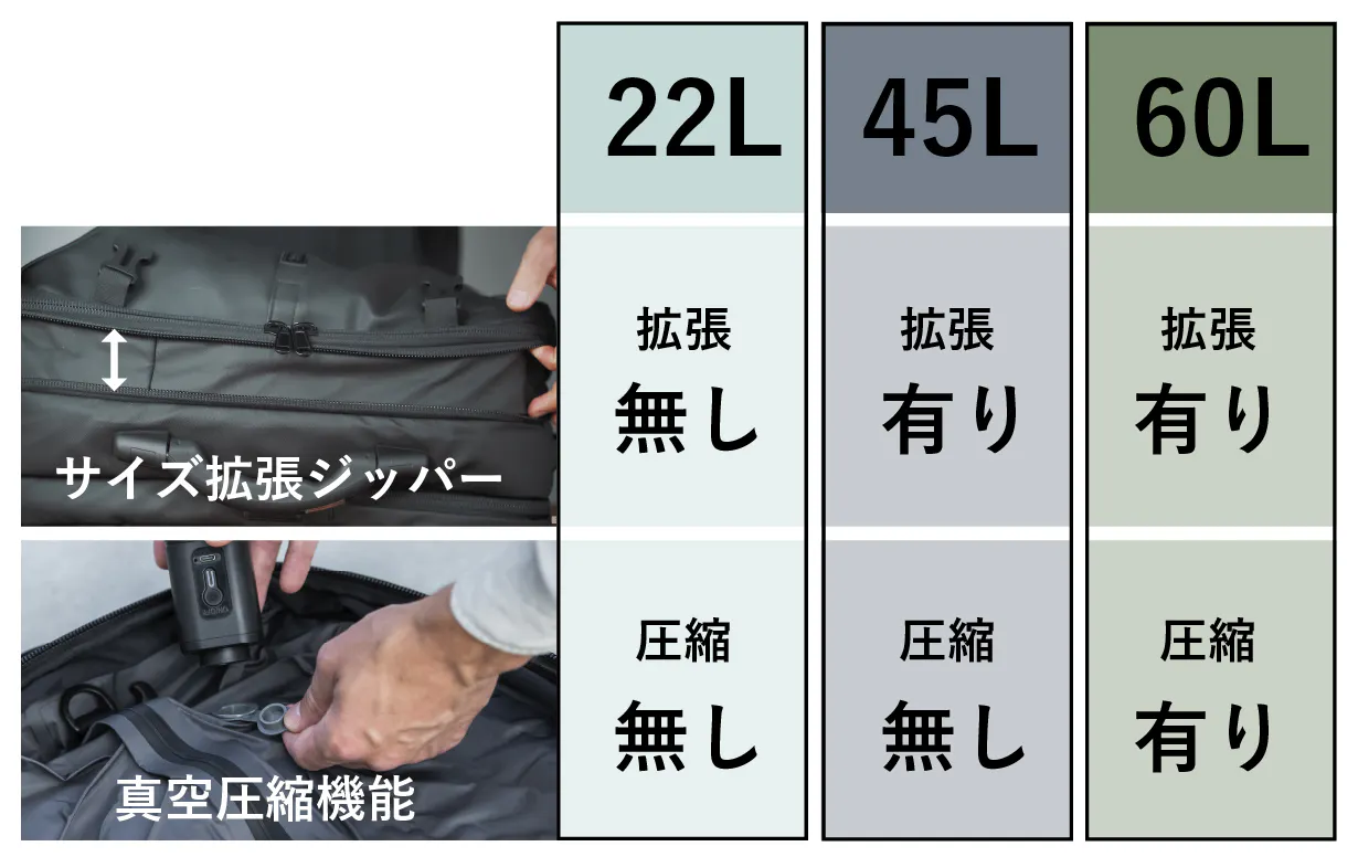 A: AIRBACKのバッグの最大容量は60Lで、サイズ拡張ジッパーで22L〜60Lまで調節可能です。