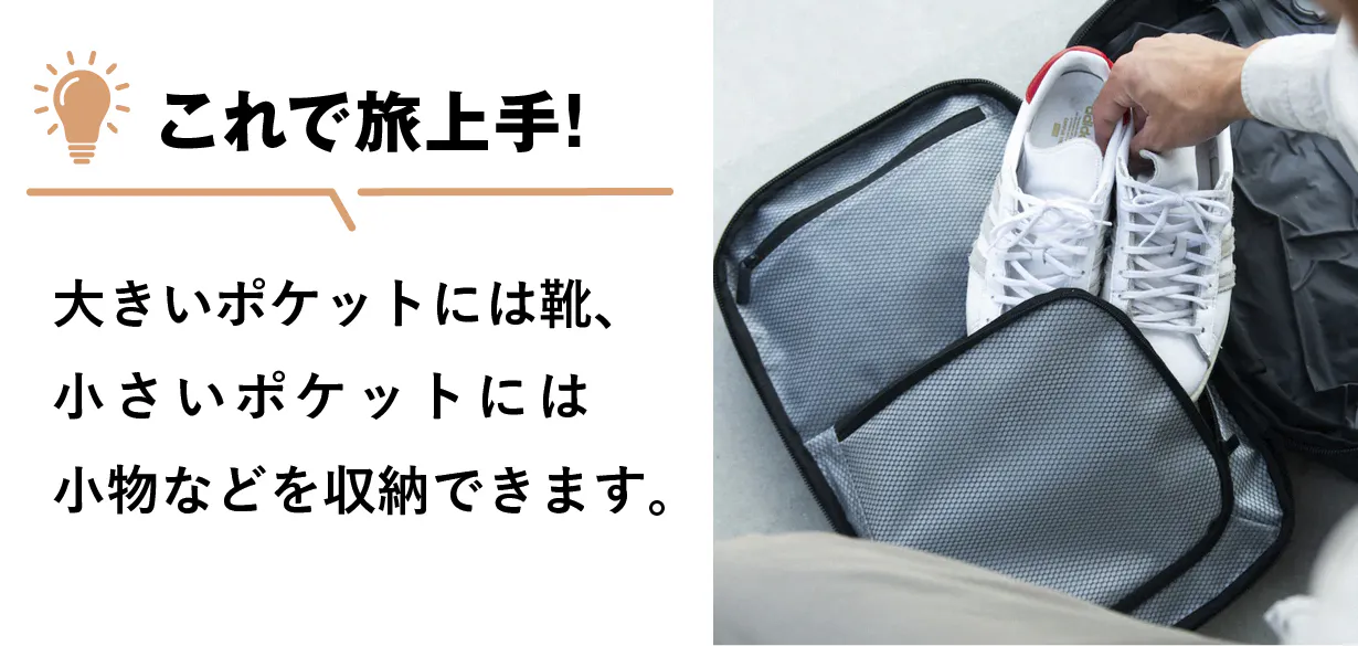 匂いを漏らさない防臭ポケットが2つ付いています。大きい方にはシューズ類、小さい方には小物類が収納できます。