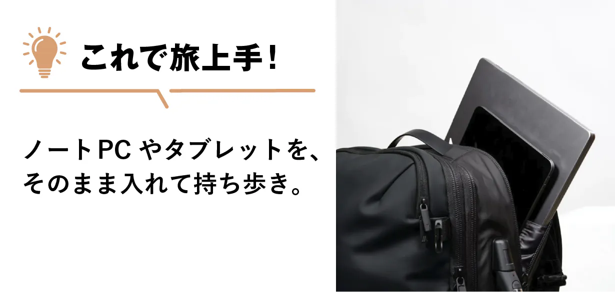 ノートPCやタブレットもそのまま収納。サッと取り出せて便利です。