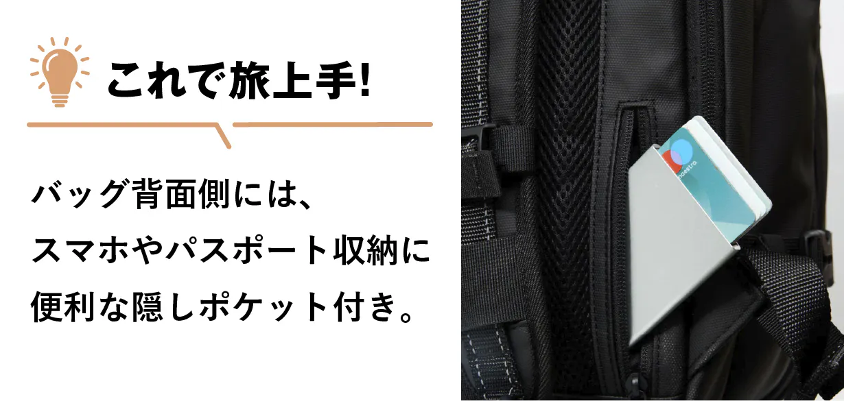 バッグ背面に貴重品の収納に便利な隠しポケットがついています。背負った時の背中に近い部分についているので、スマホやパスポート、クレジットカードなどの大切なものを守ってくれます。