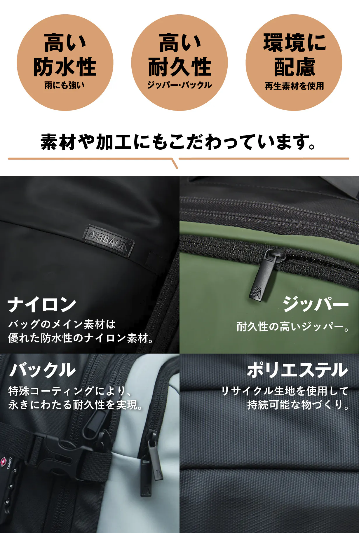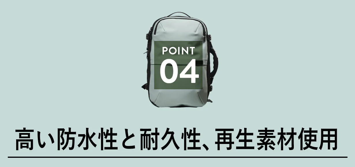 ジッパー部分も耐久性が高く、バックル部分は特殊コーティングで耐久性を強化しました。ポリエステル部分はリサイクル素材を使用しており、環境にも配慮しています。