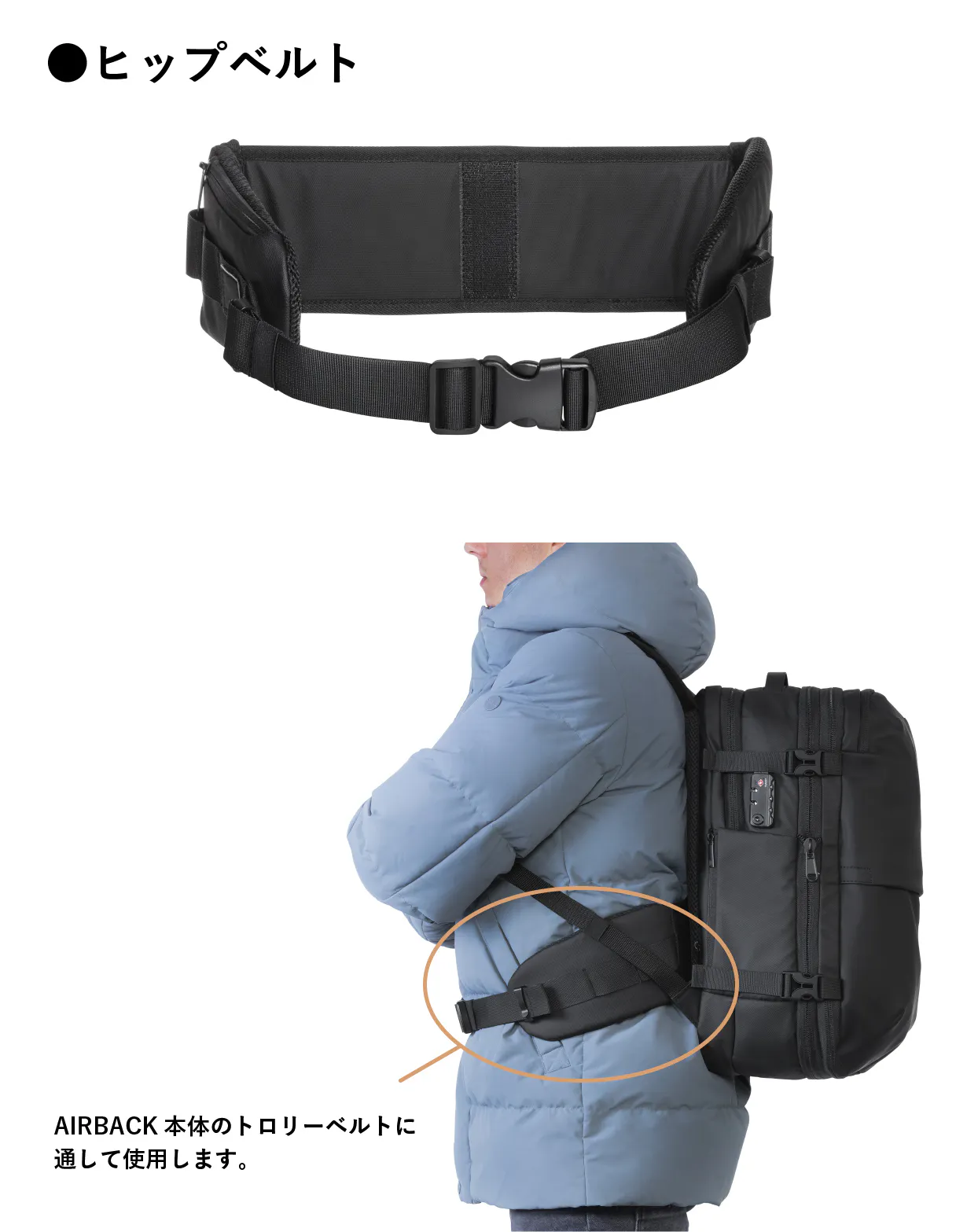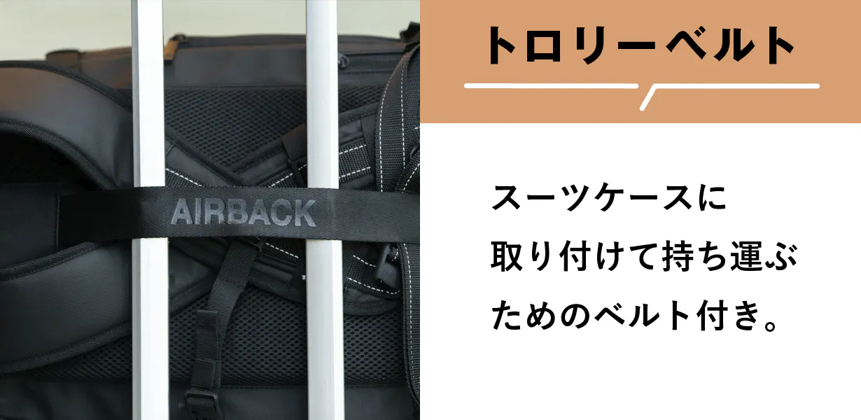 肩にかかる負担を軽くするためのヒップベルトです。荷物が重い時になどに。AIRBACK本体のトロリーベルトに通して使用します。