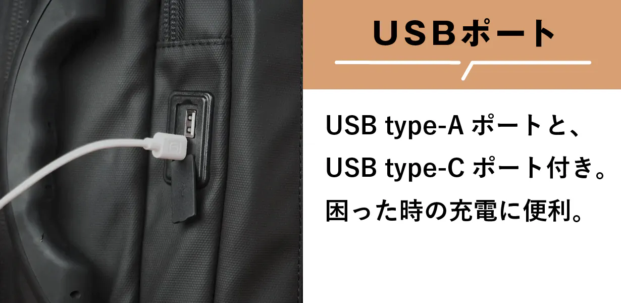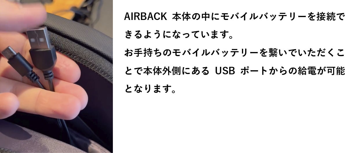 A: バッグ内にモバイルバッテリー取り付け用のケーブルが付いています。お手持ちのモバイルバッテリーをパワーバンクとして取り付けてお使いください。
