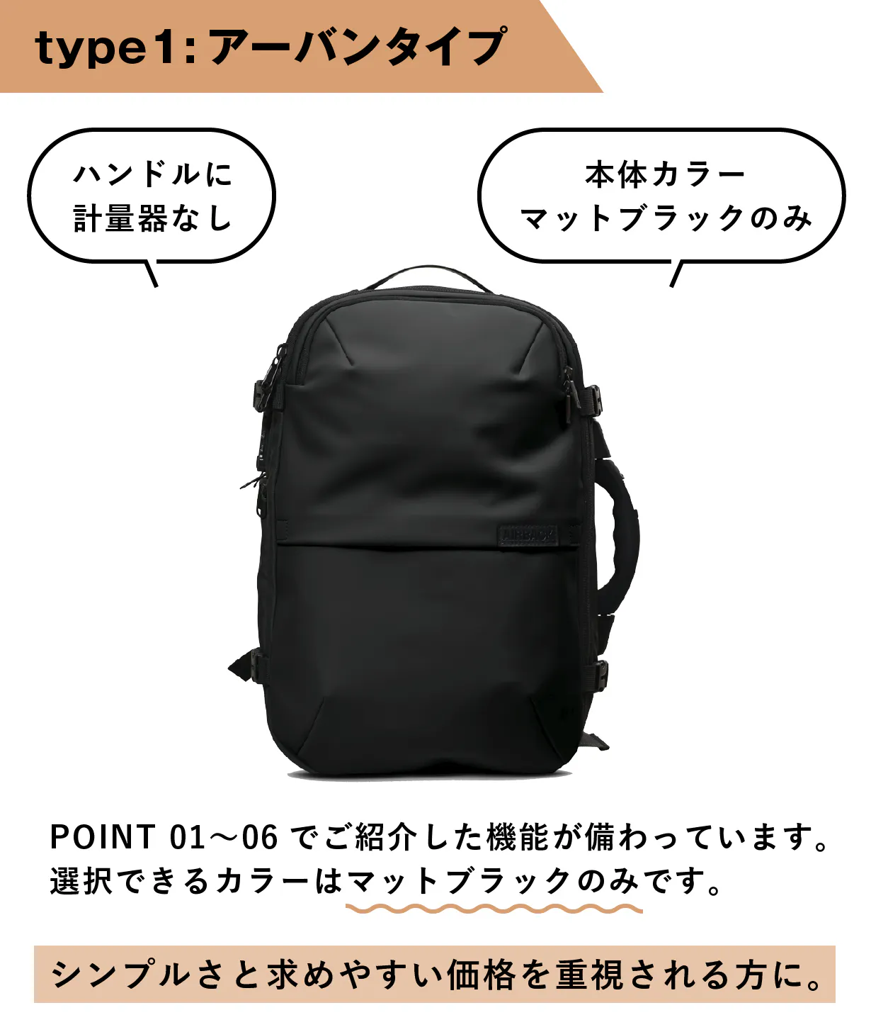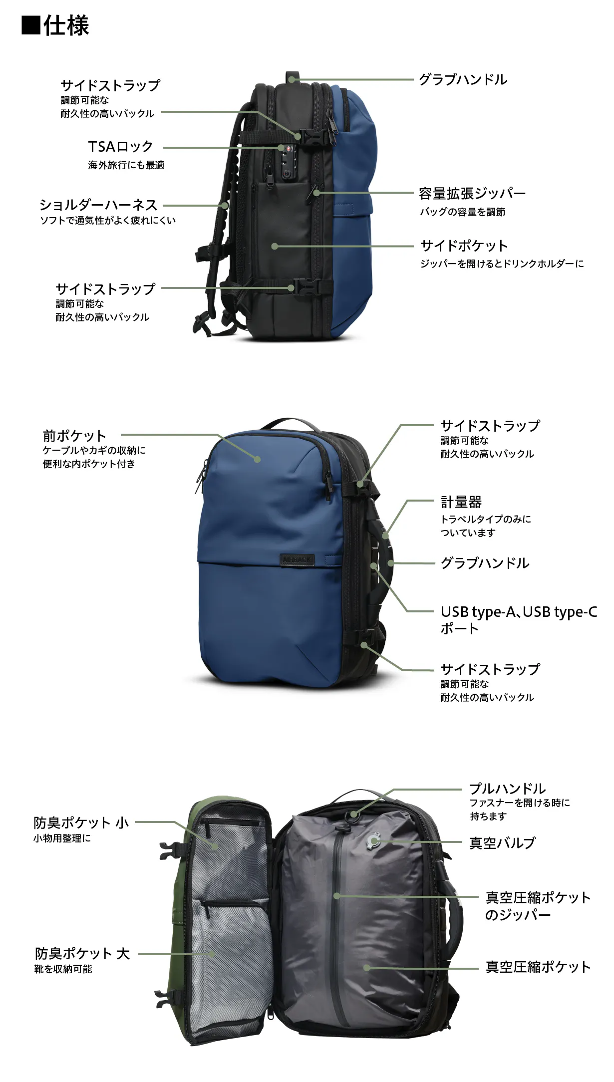 A: クッション性の高いショルダーハーネス、高い防水性、スーツケース用のトロリーベルト付き、TSAロック付き、USBポート(type-Cとtype-A)付き、トラベルタイプには計量器付き、などの特徴があります。