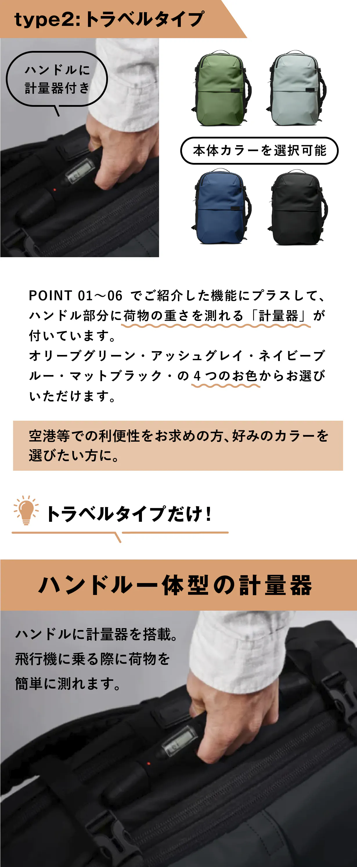 トラベルタイプにのみ、ハンドルに計量器が付いています。飛行機に乗る際などに荷物の重さを素早くチェックすることができます。