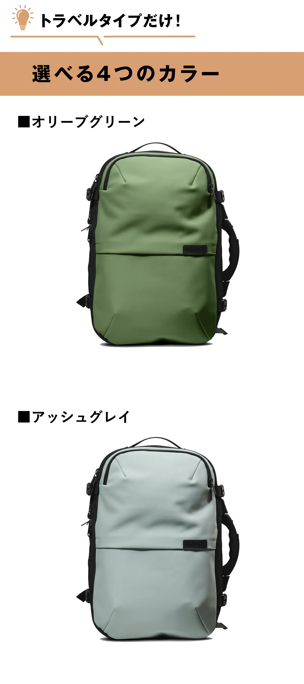 トラベルタイプは、オリーブグリーン、アッシュグレイ、ネイビーブルー、マットブラックの4つのカラーからお選びいただけます。