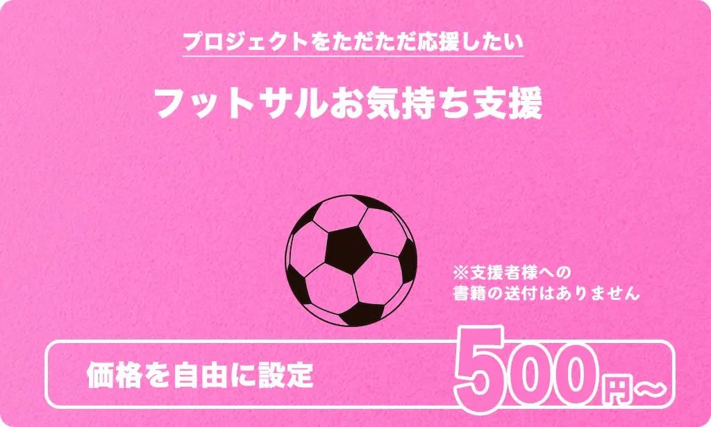 したがって、500円という支援金額を最初のリターンに設定しました。これは、本が買えるわけではなく、本の発送の原資になるものですが、共通の志をもった方がフットサルに対して支援することで共通認識を持ち、盛り上がることを期待したものです。一緒に話題をつくっていきましょう。ご支援のほどよろしくお願いいたします。
