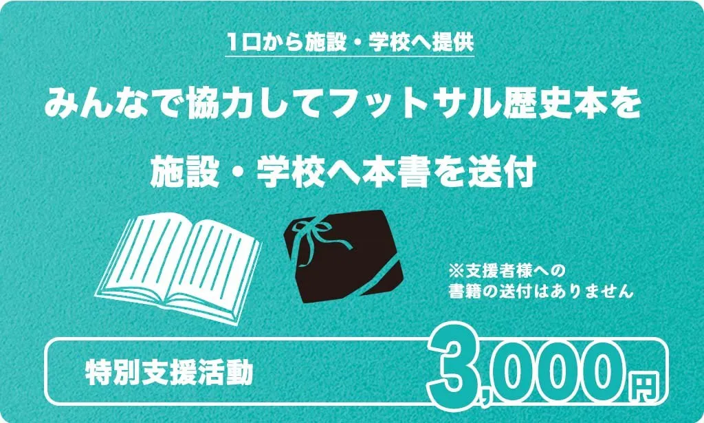 本書の提供先は、フットサルに取り組む部活・サークルのある高校、大学を考えています。大学は日本サッカー協会主催の全日本大学フットサル選手権に参加する各地域と、その付属高校の合計100校程度を想定しています。「特別支援活動」の3,000円を支援していただくと、一口につき1冊を任意の提供先に発送します。希望の提供先がある場合は備考欄にご記載ください。