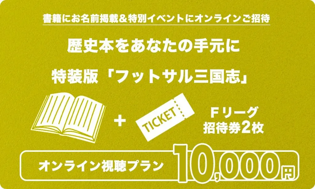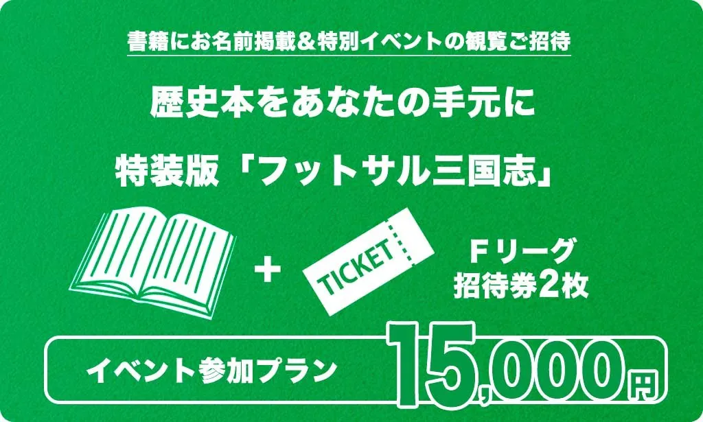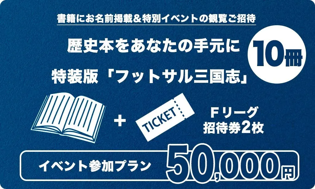すでにFリーグを認知し、観戦経験のある方には、本を購入してもらい、家族や友人・知人を誘って一緒に見に行ってもらいたいと考えています。本を読み、口伝えでフットサルの歴史を伝える営業マンのような役割を担っていただけると幸いです。5,000円の支援のリターンとして、フットサル三国志1冊と、Fリーグ招待券2枚を提供します。7,000円の支援のリターンには、フットサル三国志内にスペシャルサンクスとしてお名前を記載します。また、10月に出版記念イベントを開催しますので、その際にオンライン視聴(10,000円)、会場で観覧(15,000円)の支援も用意しています。